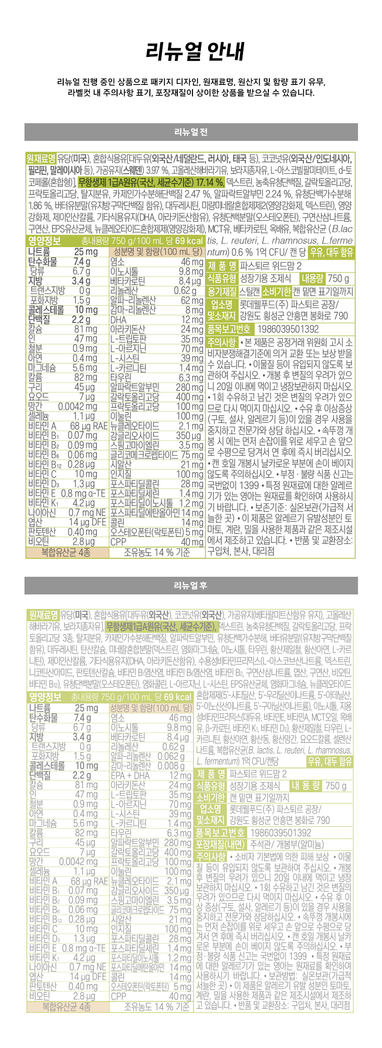 | 포장단위별 내용물의 용량(중량), 수량 | 750g * 2개 | 원재료명 및 함량 | 리뉴얼 전 : 컨텐츠 참조 / 리뉴얼 후 : 컨텐츠 참조 |