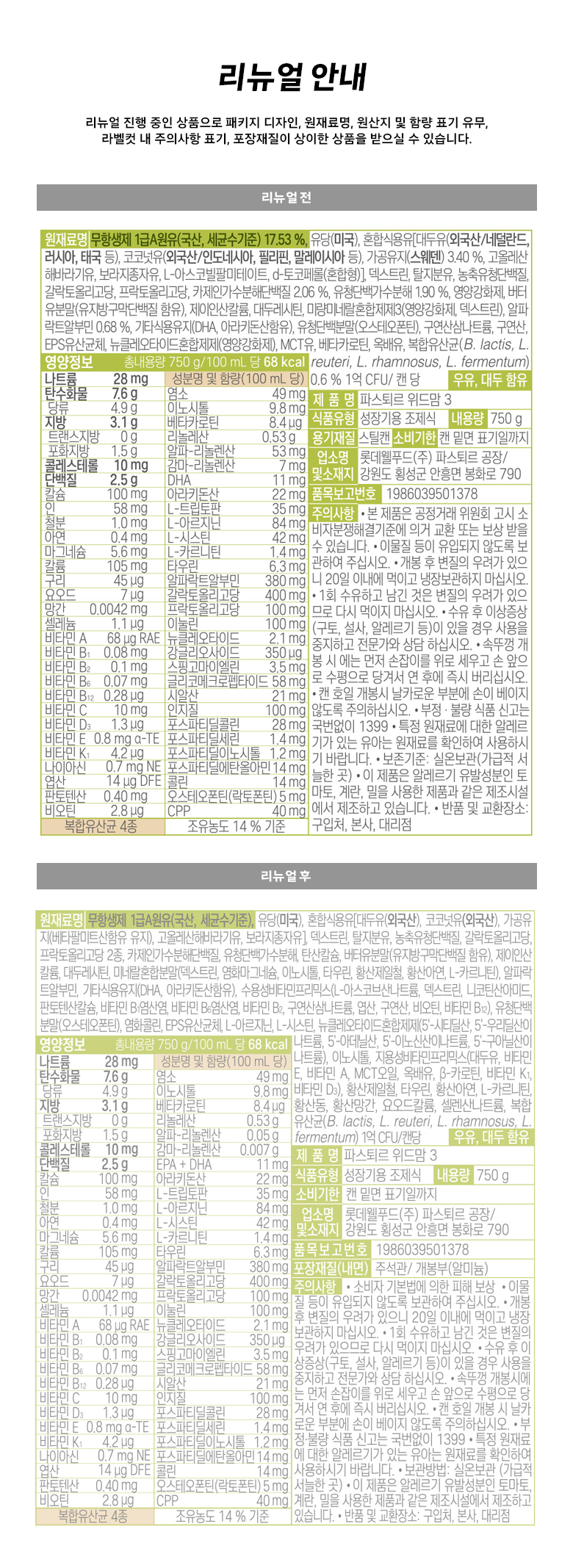 | 포장단위별 내용물의 용량(중량), 수량 | 750g * 2개 | 원재료명 및 함량 | 리뉴얼 전: 컨텐츠 참조/ 리뉴얼 후: 컨텐츠 참조 |
