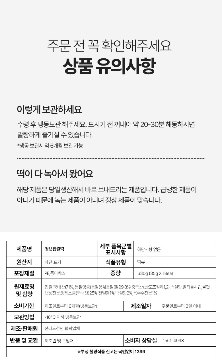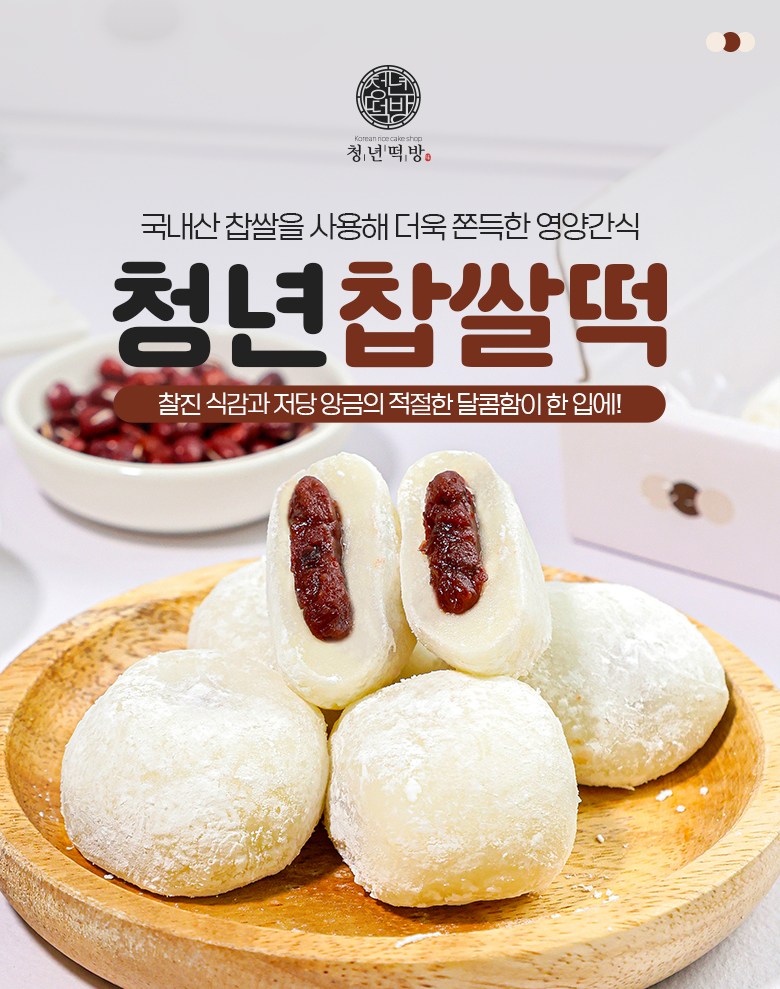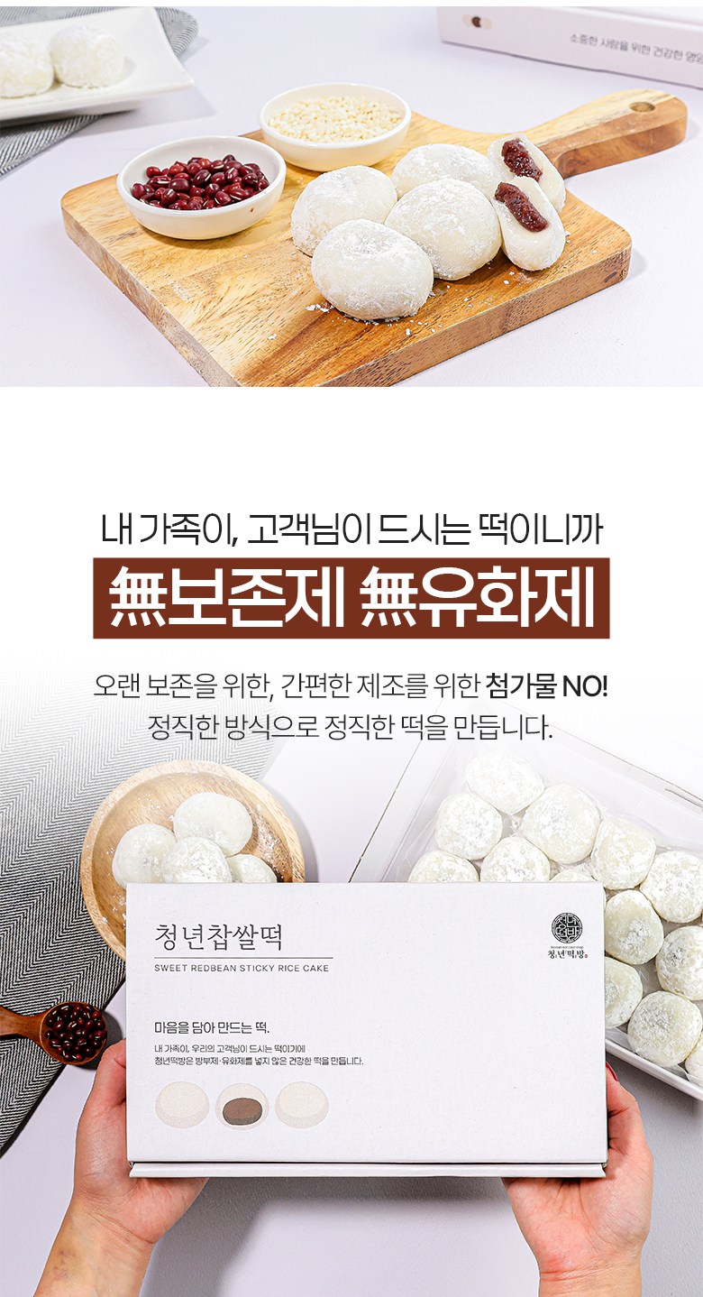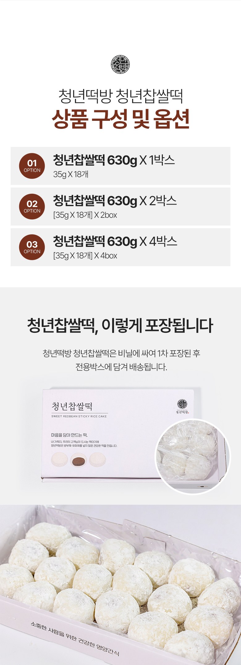 | 품목 또는 명칭 | 저당앙금으로 만든 청년 찹쌀떡 | 포장단위별 내용물의 용량(중량),수량,크기 | 630g,1박스,2박스,4박스 |