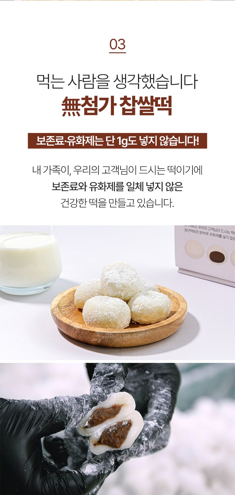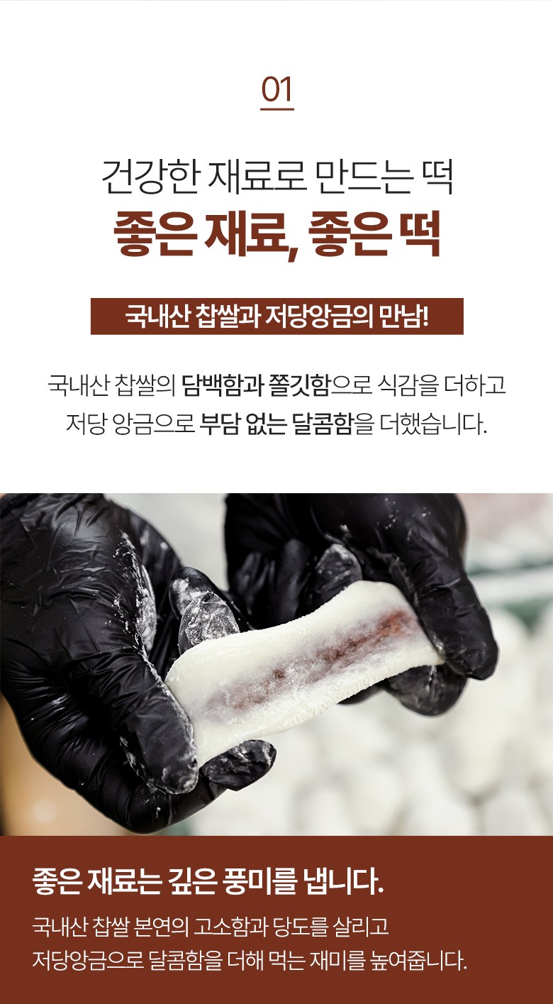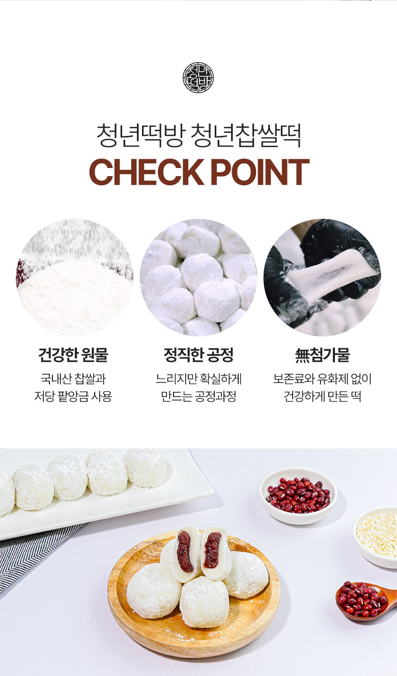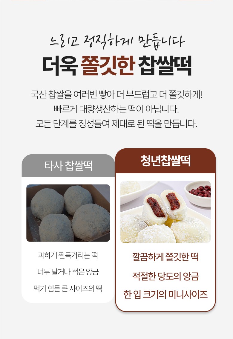 | 품목 또는 명칭 | 저당앙금으로 만든 청년 찹쌀떡 | 포장단위별 내용물의 용량(중량),수량,크기 | 630g,1박스,2박스,4박스 |