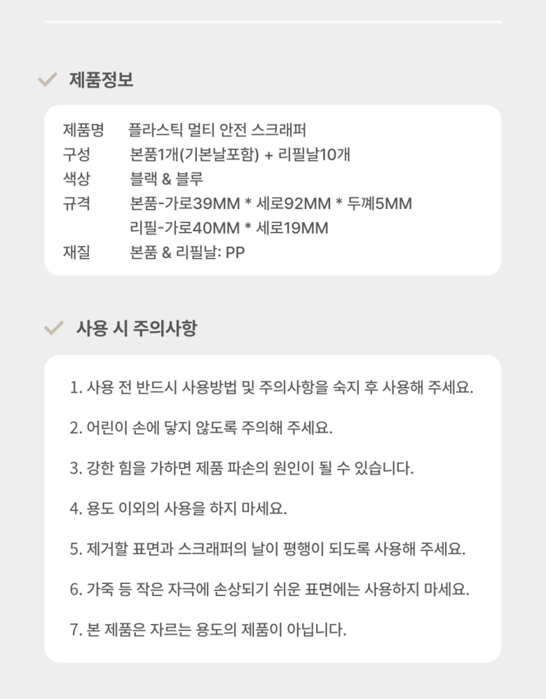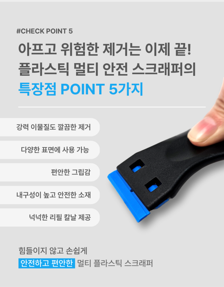 | 품명 및 모델명 | 잡화방앗간 플라스틱 멀티 안전 스크래퍼 | 인증/허가 사항 | 상품 상세페이지 참조 |