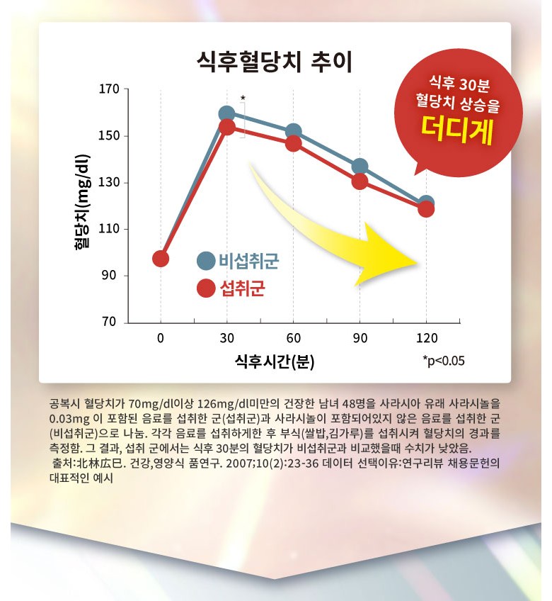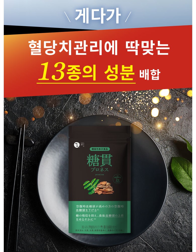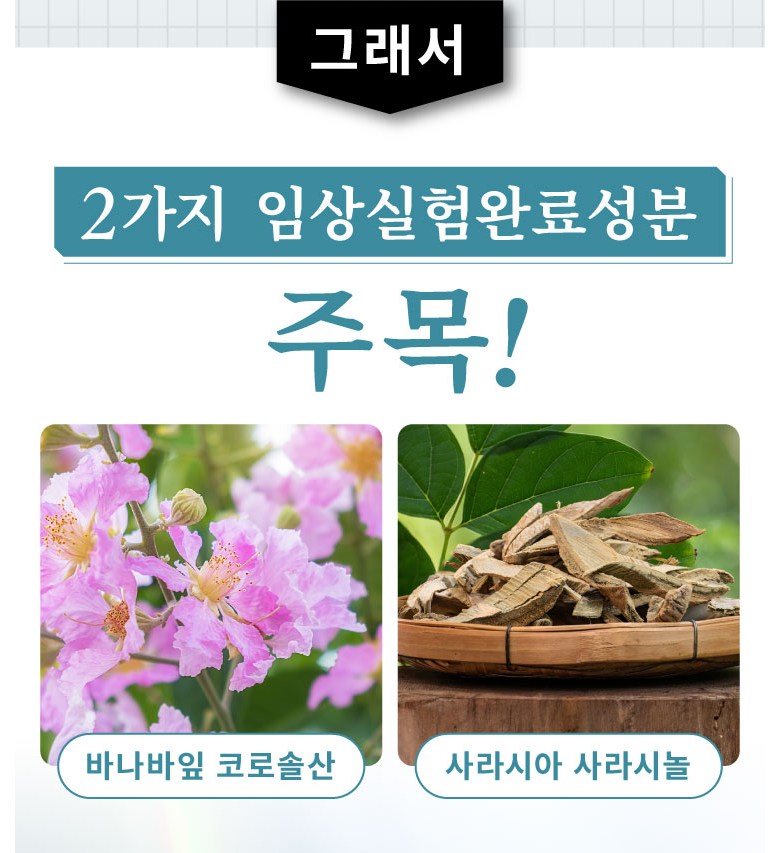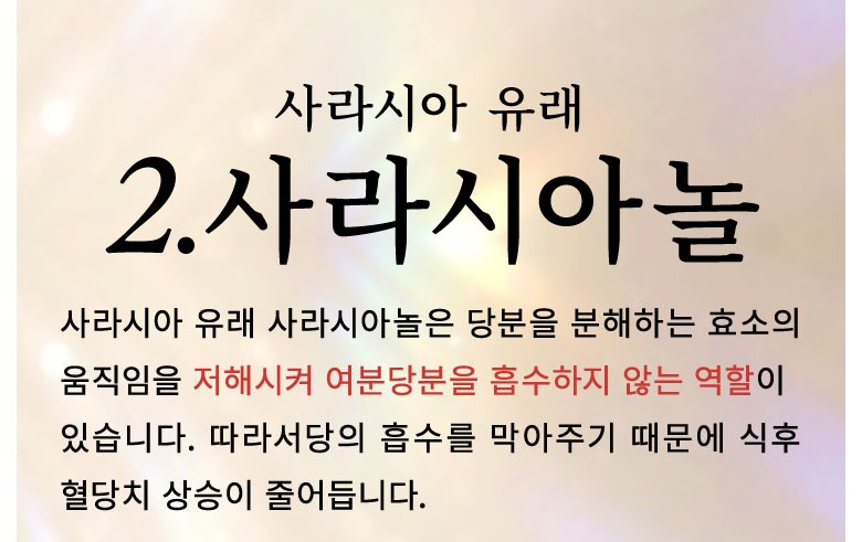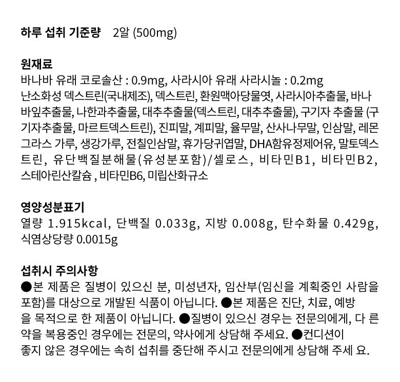| 원재료명 및 함량 | 난소화성 덱스트린(국내제조), 덱스트린, 환원맥아당물엿, 사라시아추출물, 바나바잎추출물, 나한과추출물, 나한과추출물(덱스트린, 대추추출물), 구기자추출물 (구기자추출물 , 말토덱스트린) , 진피말 , 시몬말 , 율무말 , 산사나무 추출물,고삼말, 레몬그라스말,생강말,전칠삼말,휴가당귀엽말,DHA함유정제어유,말토덱스트린,유단백질분해물(유성분포함)/셀등심,비타민B1,비타민B2,스테아린칼슘,비타민B6,미립산화규소 | 영양성분 | 2알(500mg)당] 열량 : 1.915kcal, 단백질 : 0.033g, 지방 : 0.008g, 탄수화물 : 0.429g, 식염상당량 : 0.0015g |