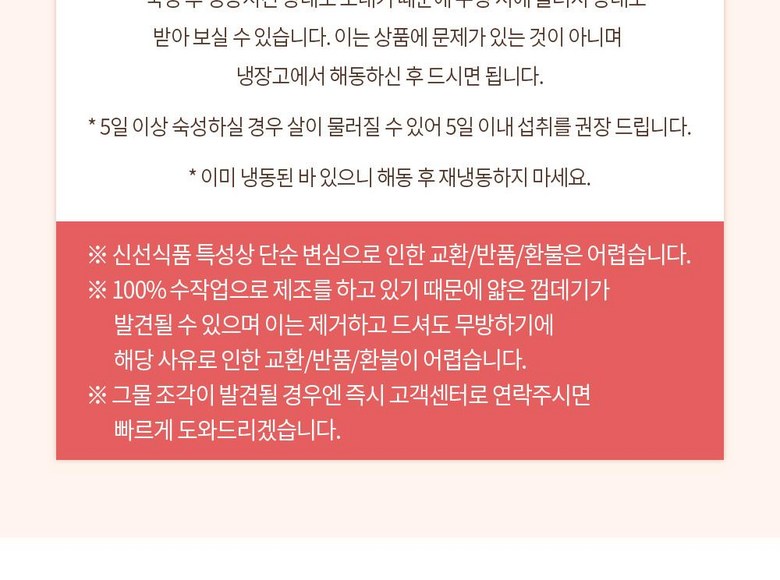 | 계절상품/식품/화장품 | ㆍ신선/냉장/냉동 상품의 단순변심의 경우 ㆍ뷰티 상품 이용 시 트러블(알러지, 붉은 반점, 가려움, 따가움)이 발생하는 경우, |