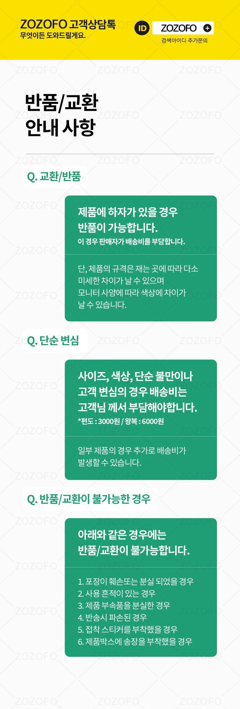 - ㆍ모니터 해상도의 차이로 인해 색상이나 이미지가 실제와 달라, 고객이 단순 변심으로 교환/반품을 무료로 요청하는 경우