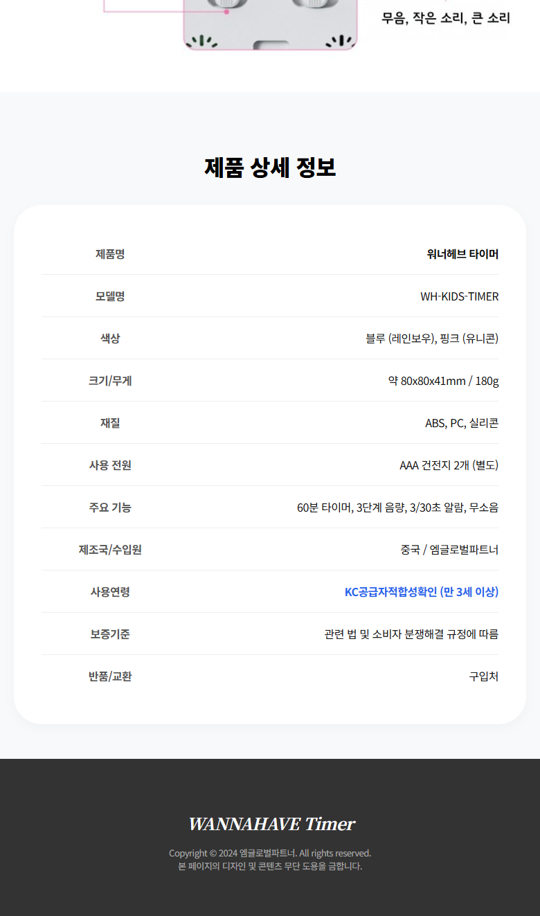 | 품명 및 모델명 | 워너헤브 타이머(Wanna Have Timer) | KC 인증정보 | KC마크 有 (공급자적합성확인 완료) |