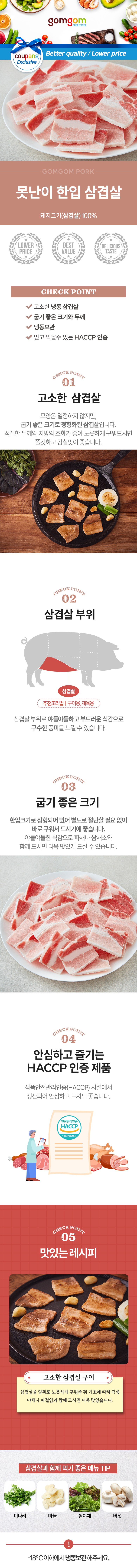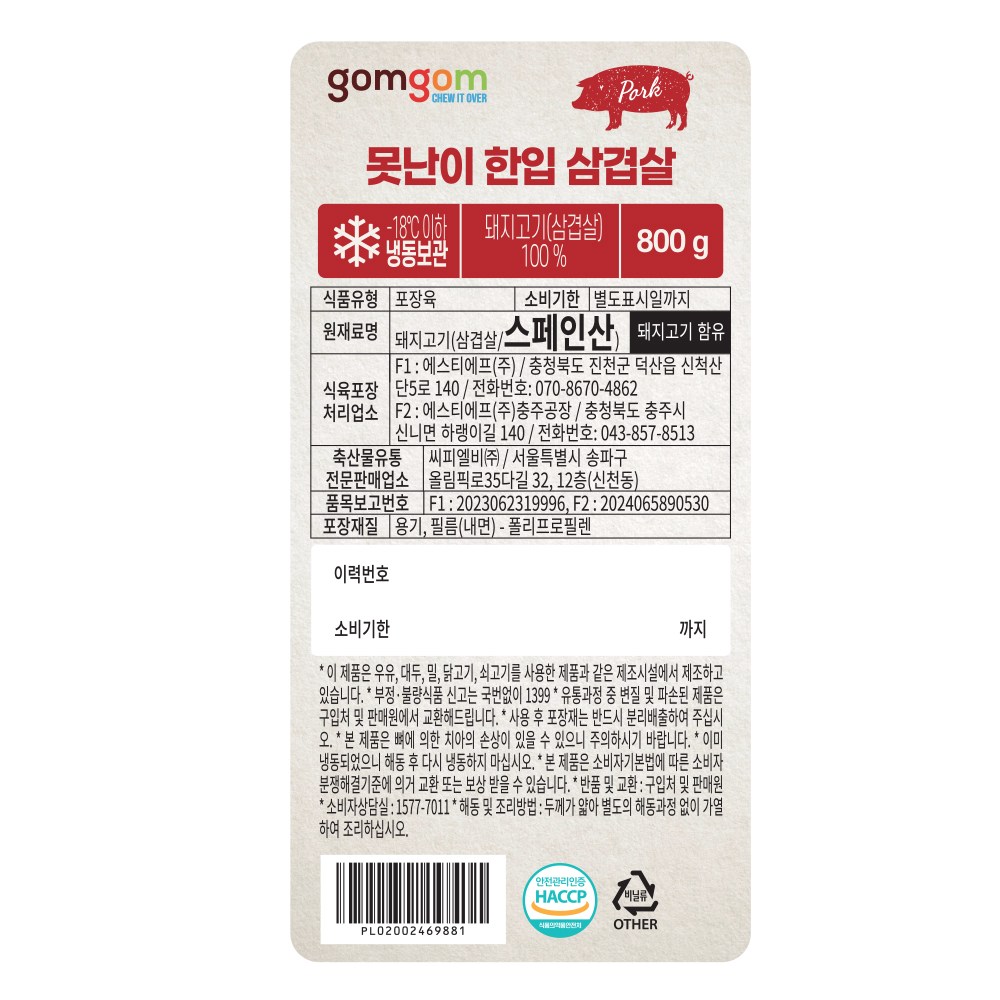 | 품목 또는 명칭 | 못난이 한입 삼겹살 | 포장단위별 내용물의 용량(중량),수량,크기 | 800g x 2개 |
