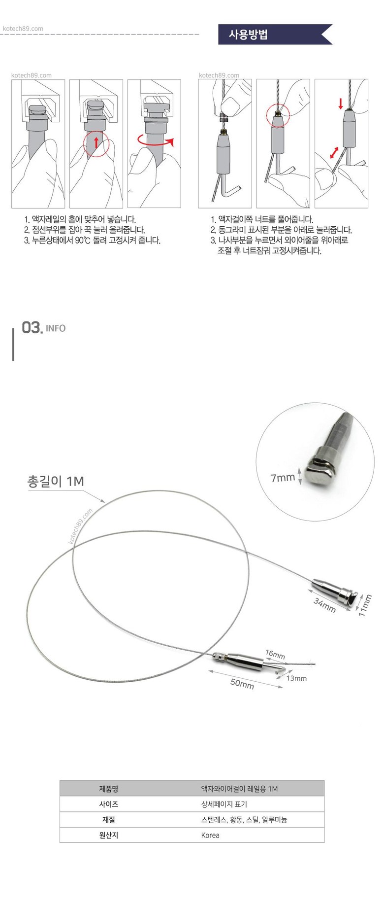 | 품명 및 모델명 | 코텍 액자걸이 와이어1M 액자레일용 실버 3개입 | 인증/허가 사항 | 해당없음 |