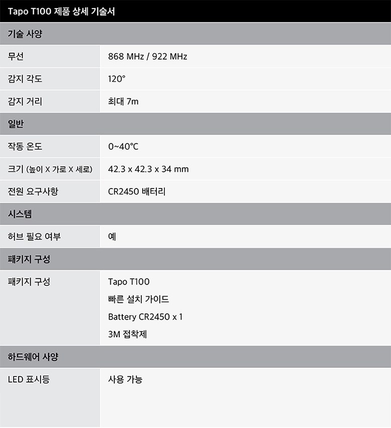 | 품명 및 모델명 | 티피링크 스마트 움직임 이동식 센서 Tapo T100 | KC 인증정보 | R-R-tPC-TapoT100 |
