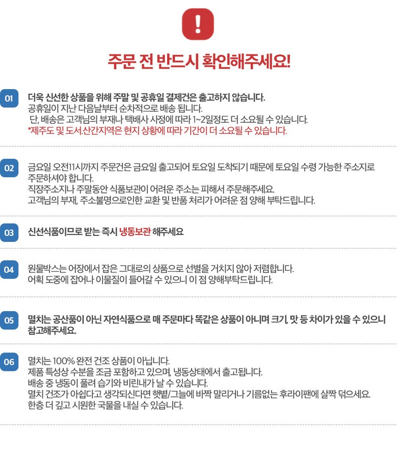 | 배송방법 | 신선/냉장/냉동 | 배송비 | 무료배송 - 도서산간 지역 배송불가 |