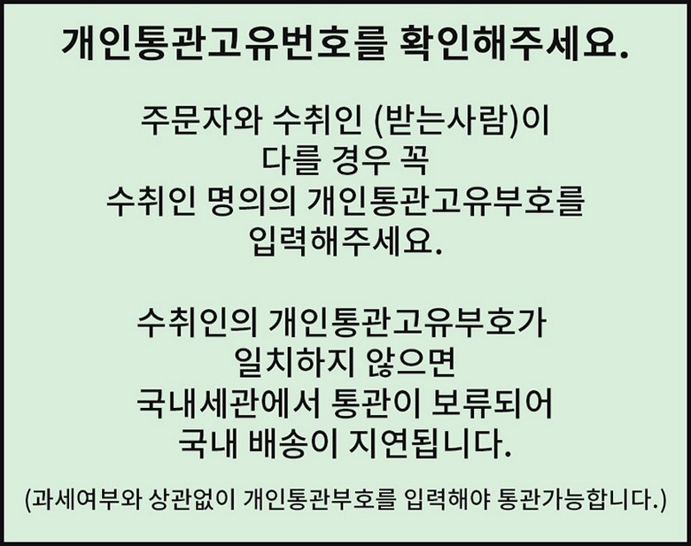 - 법규 개정에 따라 개인통관고유부호 검증 절차가 강화되었습니다. 결제 단계에서 받는 사람의 정보가 관세청 등록 정보 (성명, 휴대폰, 개인통관고유부호, 주소) 와 일치하는지 확인해주세요.