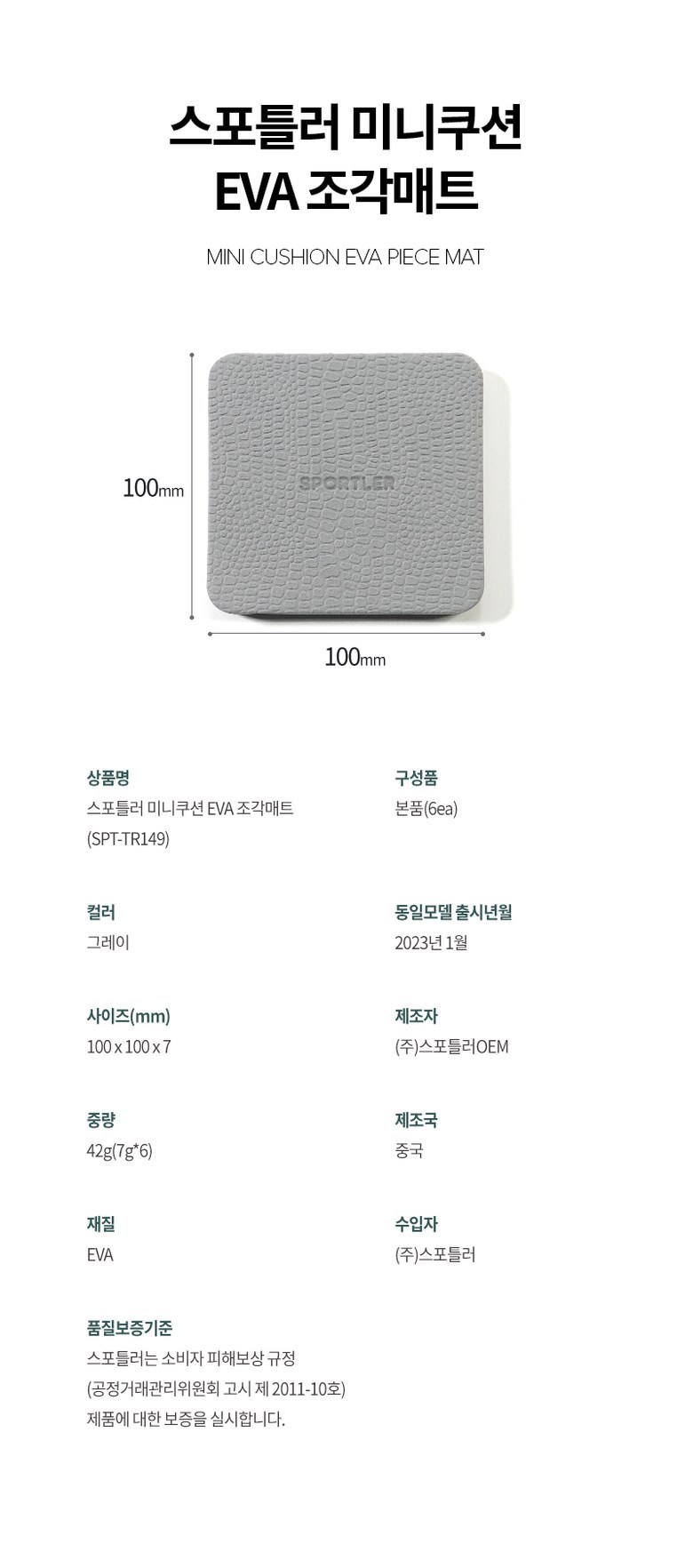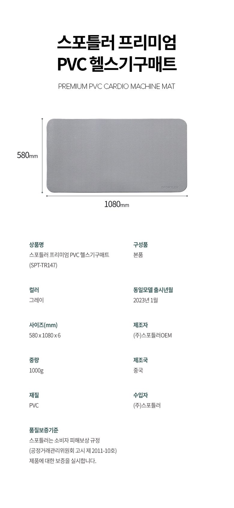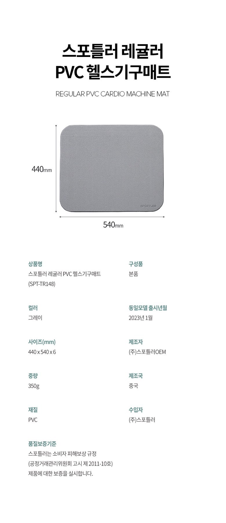 | 품명 및 모델명 | 스포틀러 PVC 헬스 기구 매트 REGULAR | KC 인증정보 | 해당없음 |