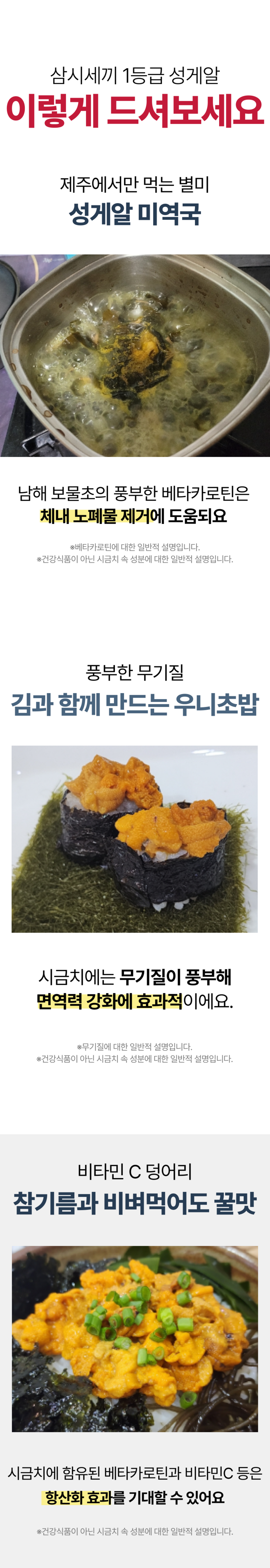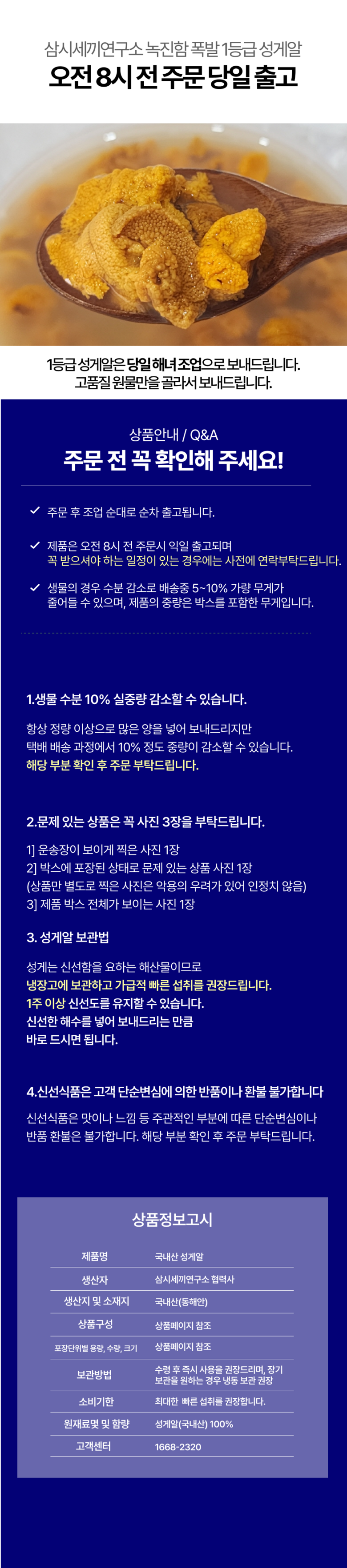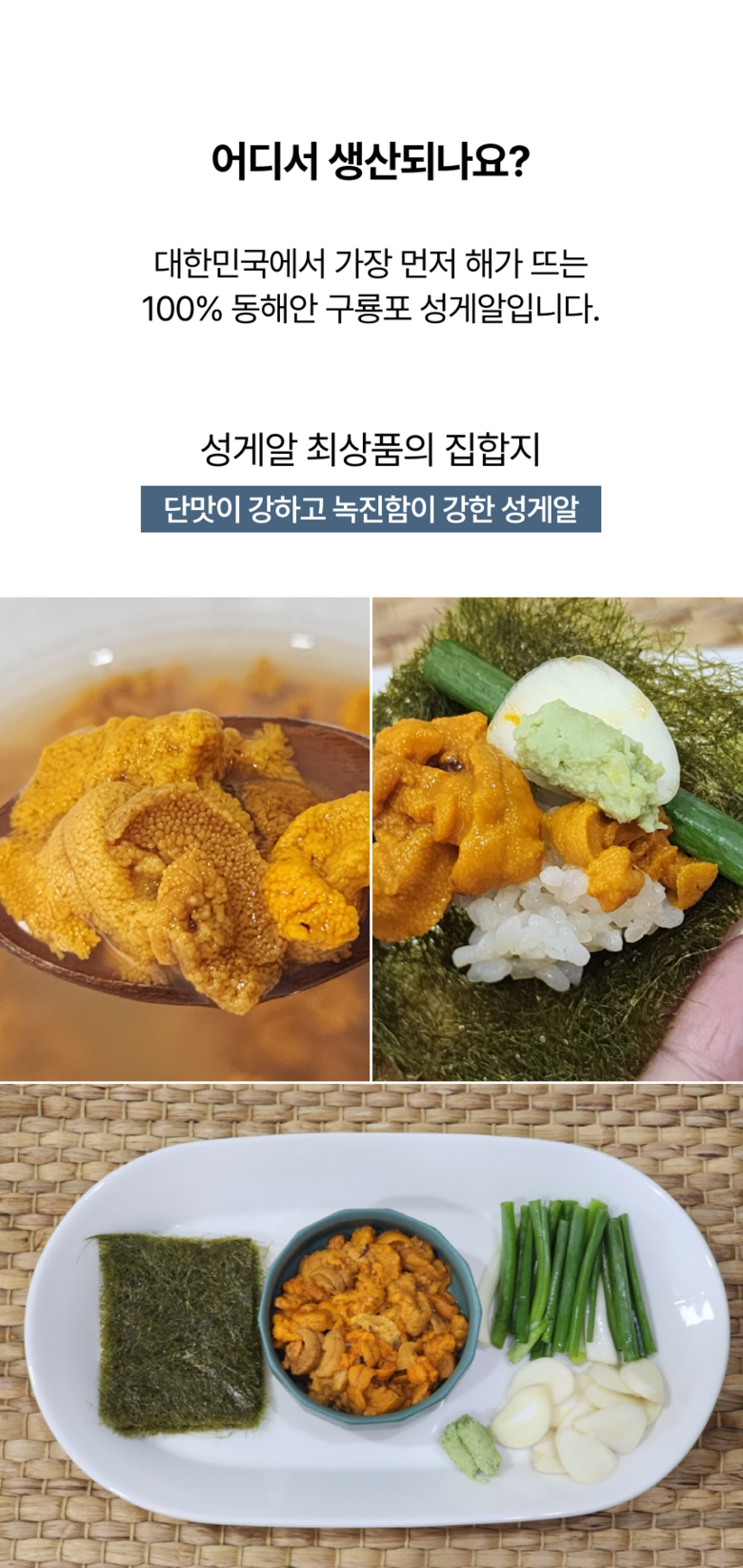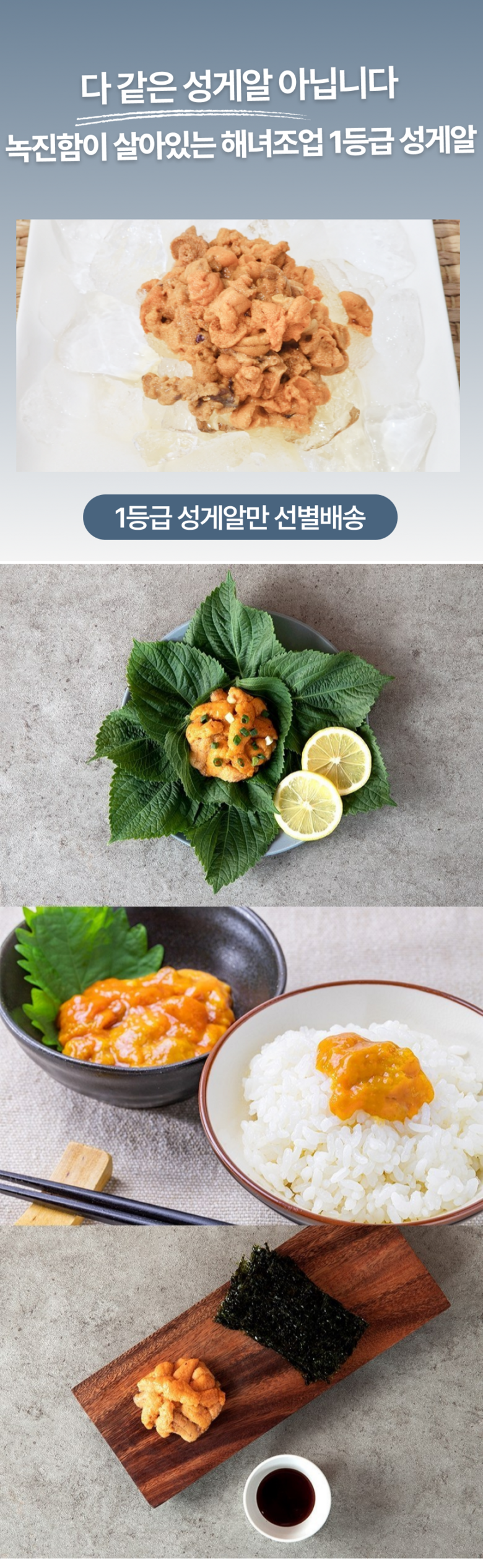 | 품목 또는 명칭 | 국산 성게알 | 포장단위별 내용물의 용량(중량),수량,크기 | 상품 상세페이지 참조 |