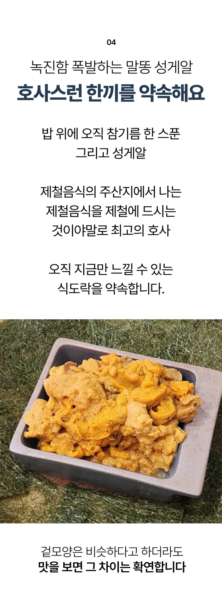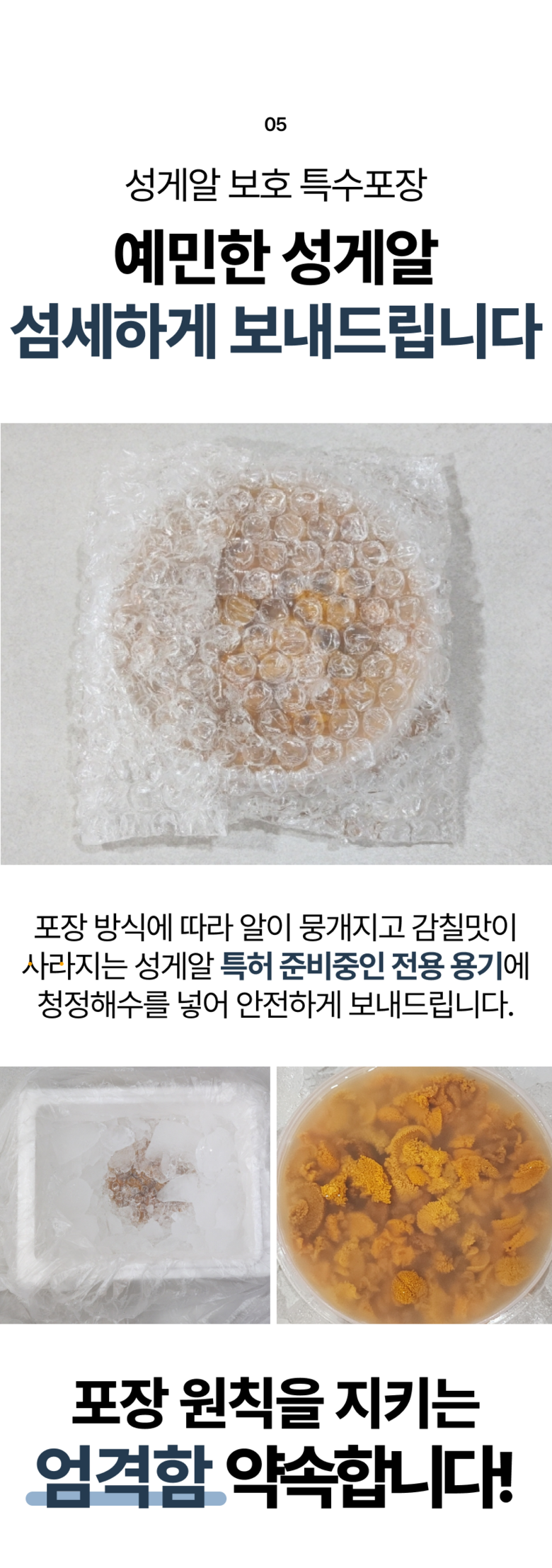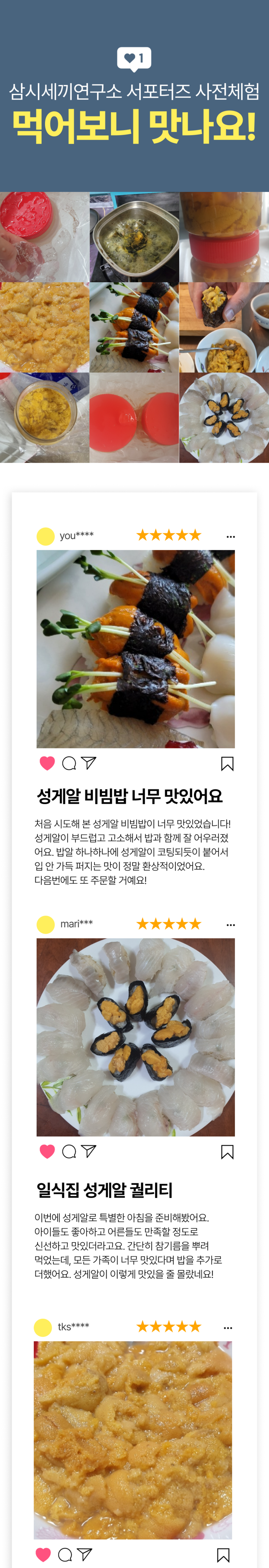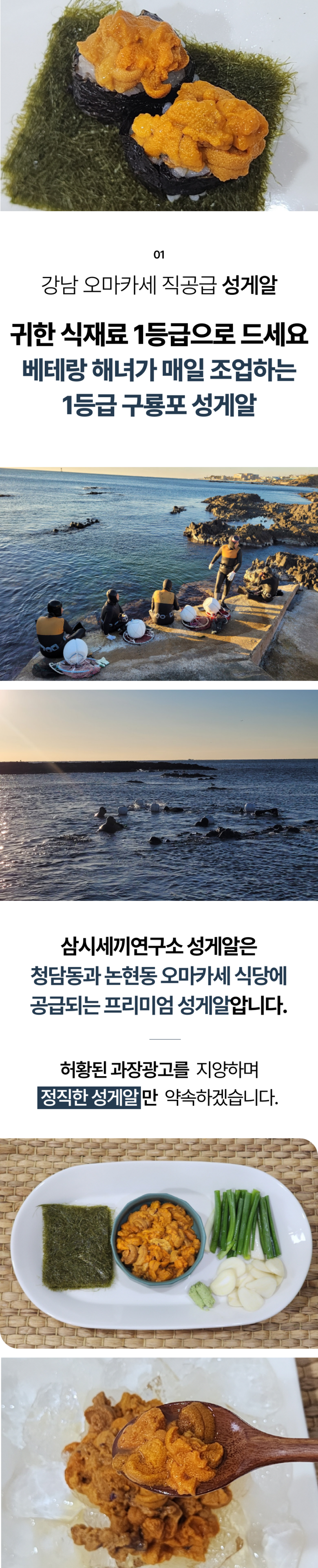 | 품목 또는 명칭 | 국산 성게알 | 포장단위별 내용물의 용량(중량),수량,크기 | 상품 상세페이지 참조 |
