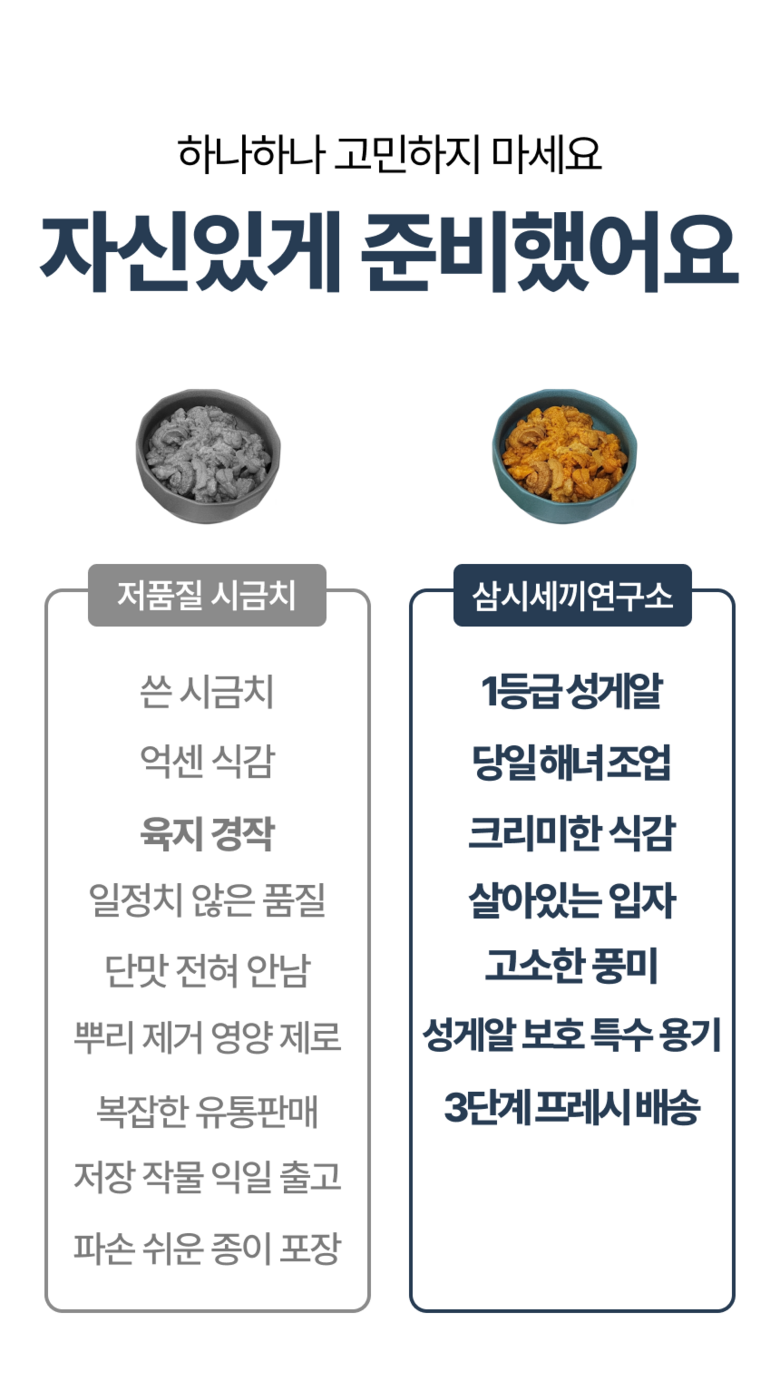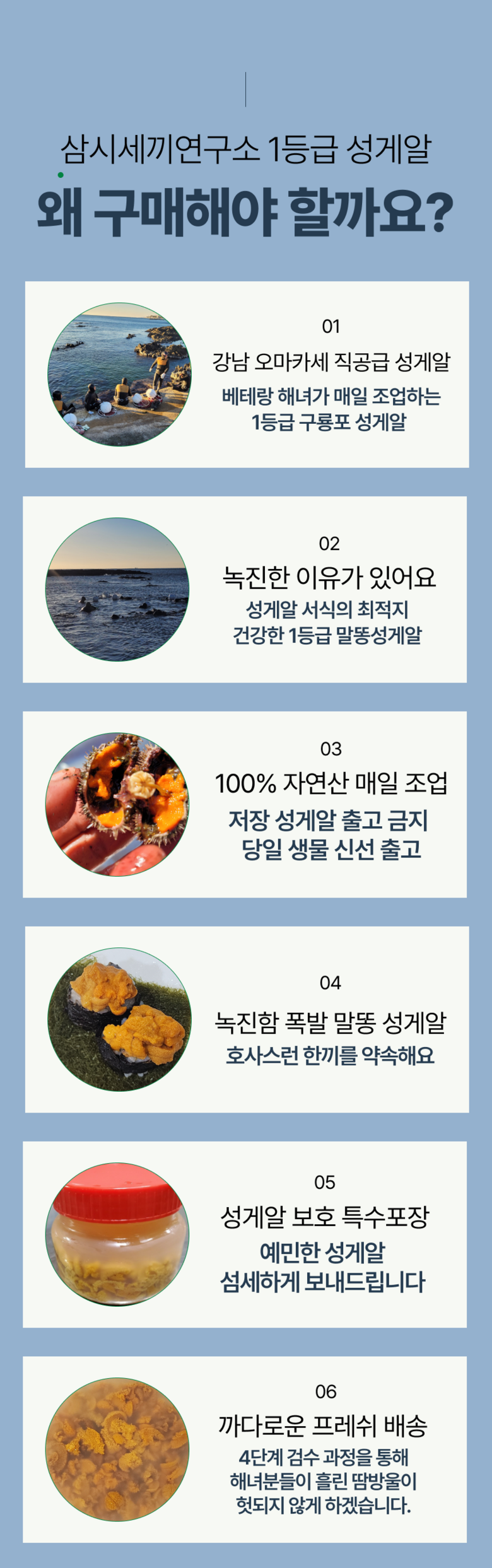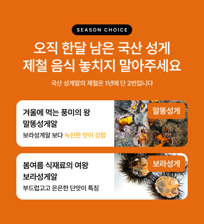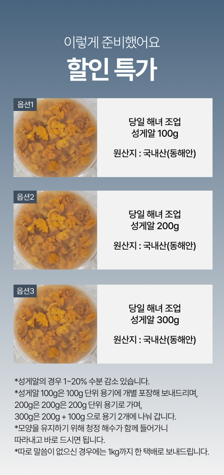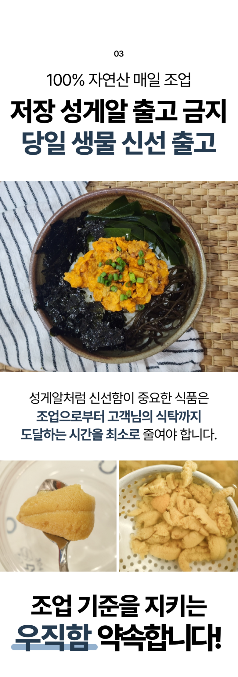 | 품목 또는 명칭 | 국산 성게알 | 포장단위별 내용물의 용량(중량),수량,크기 | 상품 상세페이지 참조 |