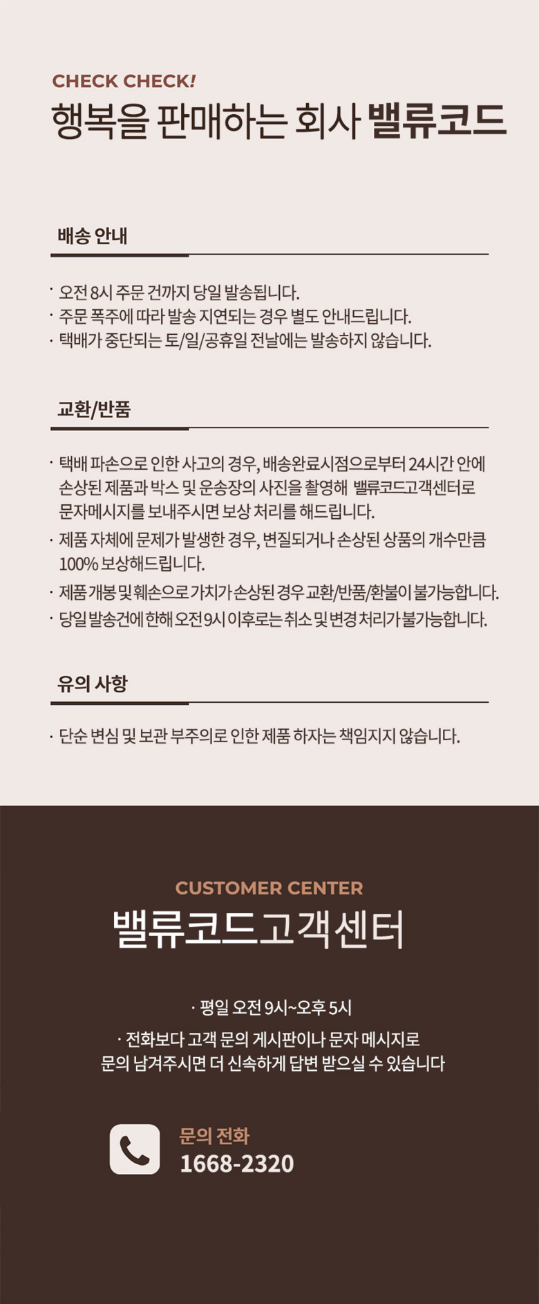 | 교환/반품 비용 (왕복비용) | 3,000원 - 단, 고객 변심의 경우에만 발생 - 도서산간 지역 배송불가 |