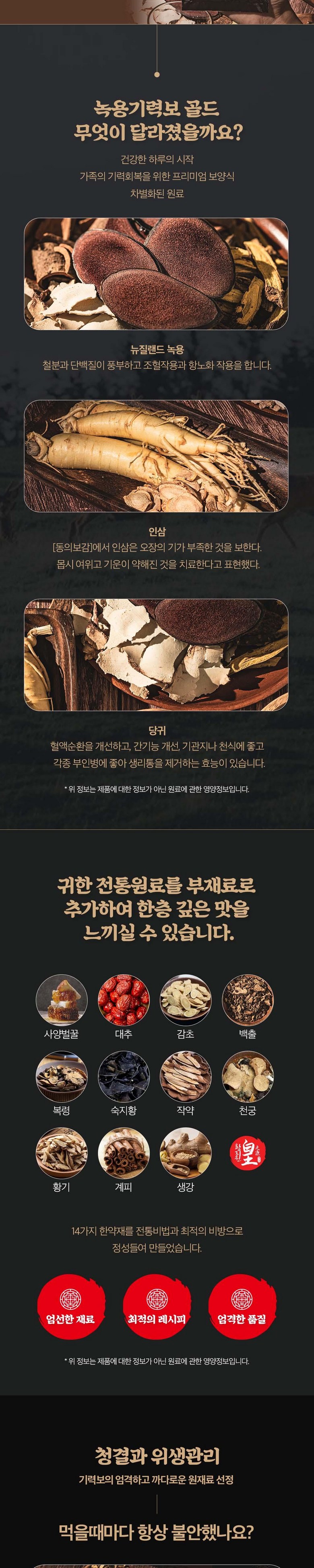 | 포장단위별 내용물의 용량(중량), 수량 | 2,100ml (70ml, 30포) | 원재료명 및 함량 | 정제수, 사양벌꿀(국내산), 대추(국산), 감초(국산), 인삼, 백출, 복령, 숙지황, 작약, 천궁, 당귀, 황기, 계피, 생강, 녹용(뉴질랜드산) |