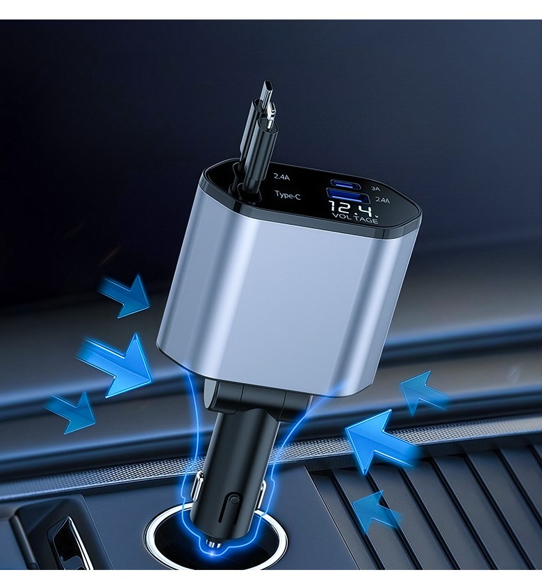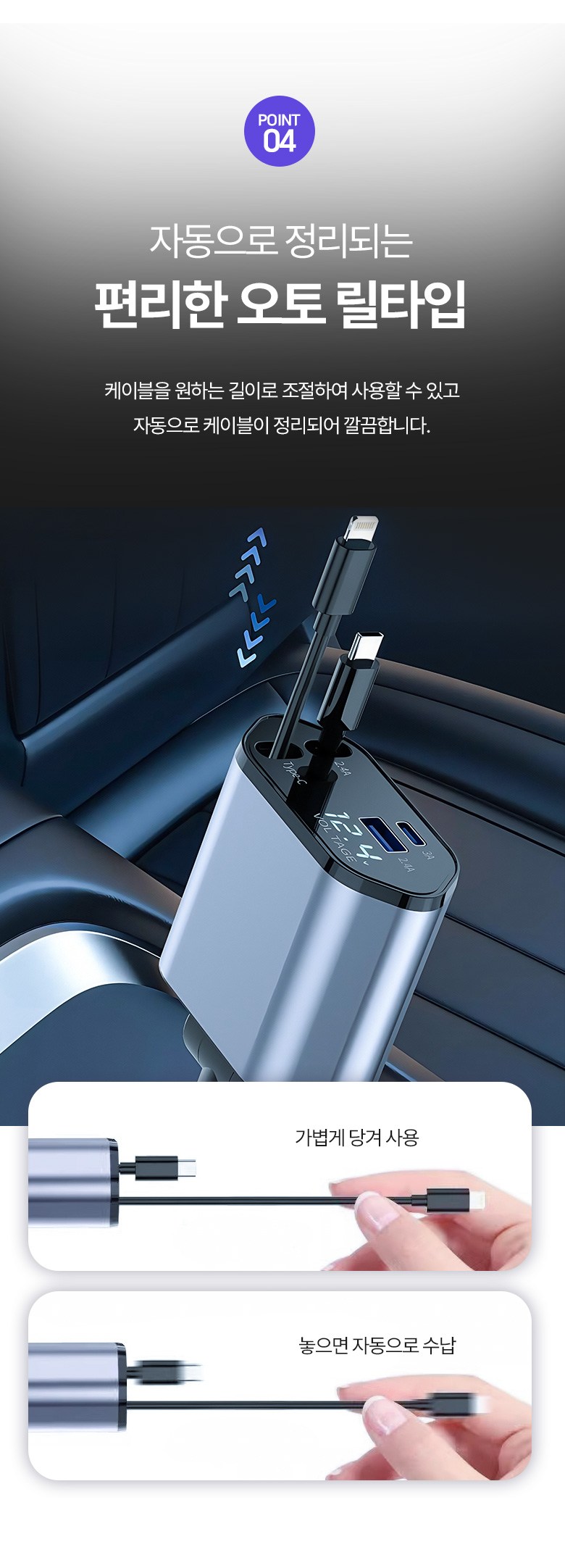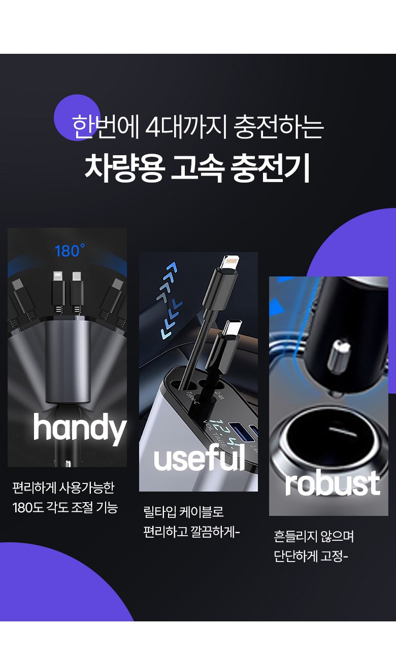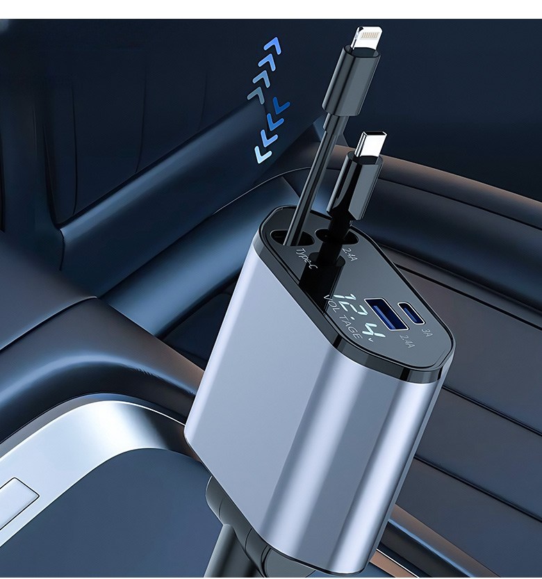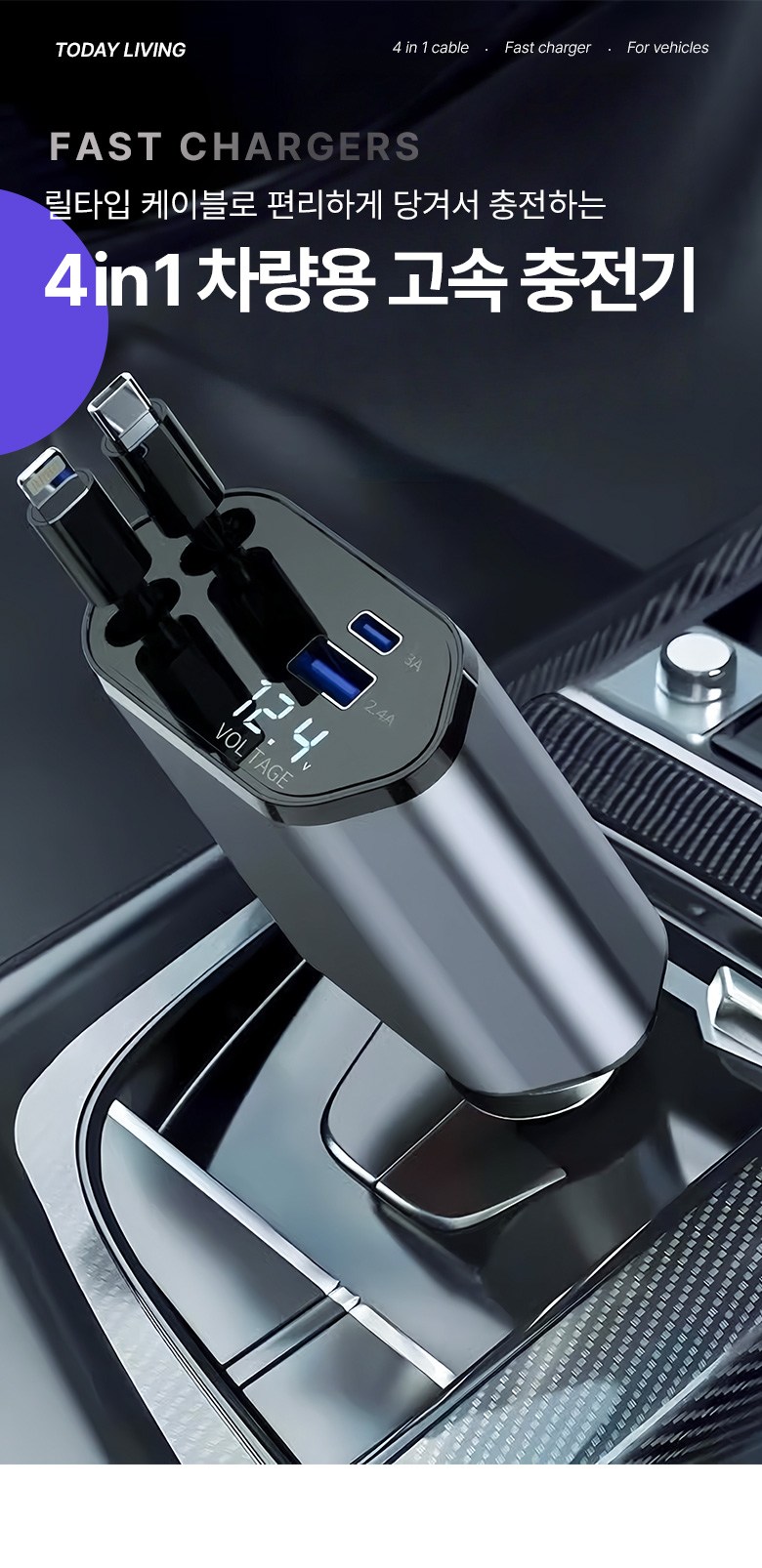 투데이리빙 4in1 릴타입 차량용 고속 충전기 각도 조절 c타입 8핀 핸드폰 동시 4대 충전 케이블 usb 어댑터 휴대폰 퀵차지 릴케이블 시거잭 릴충전기