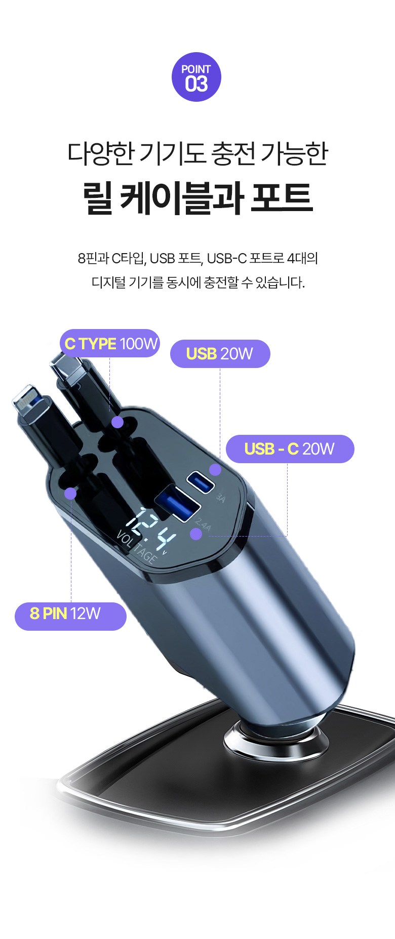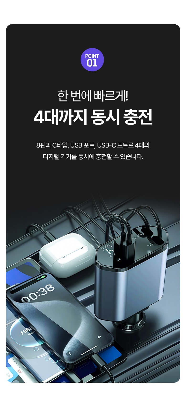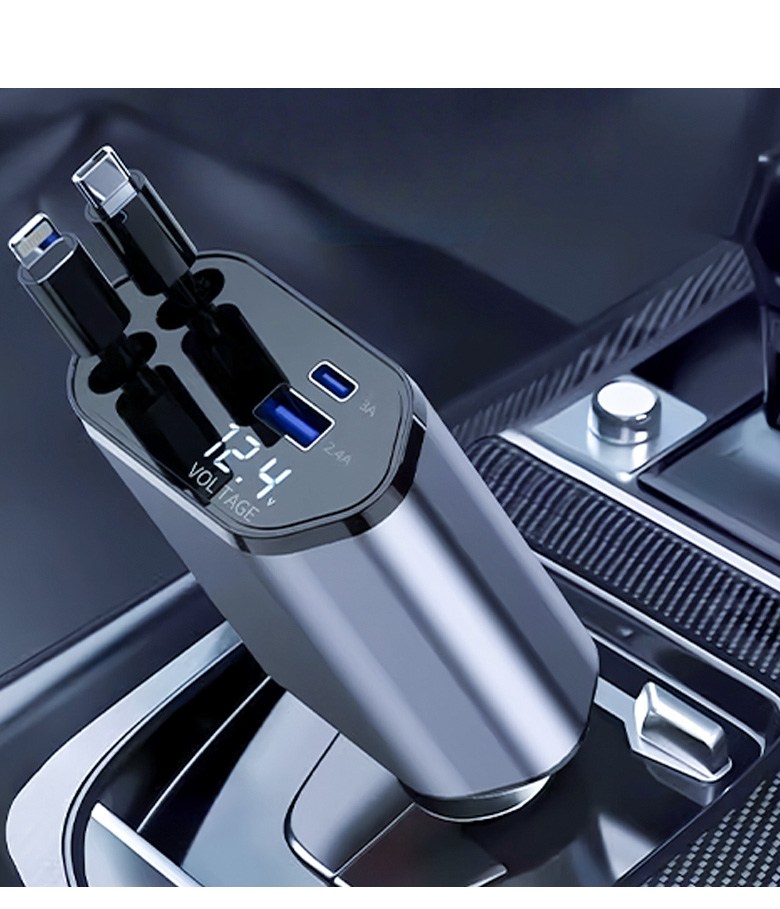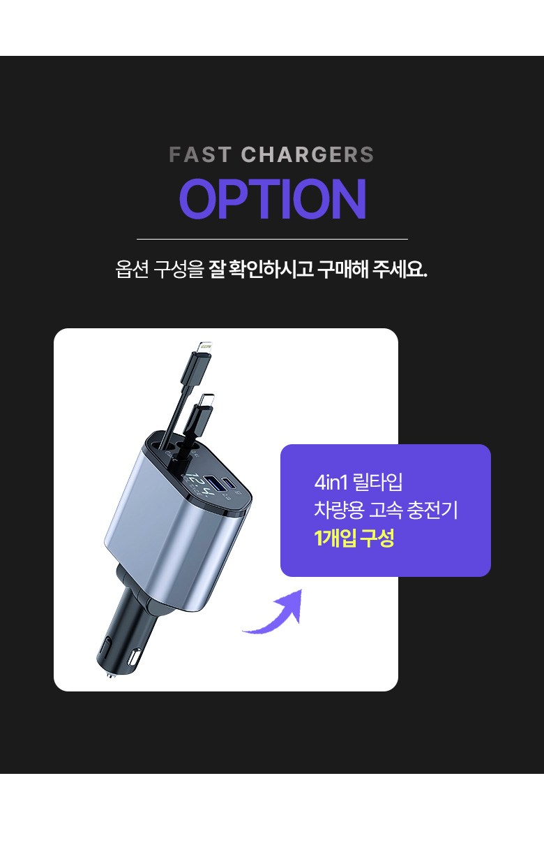 투데이리빙 4in1 릴타입 차량용 고속 충전기 각도 조절 c타입 8핀 핸드폰 동시 4대 충전 케이블 usb 어댑터 휴대폰 퀵차지 릴케이블 시거잭 릴충전기