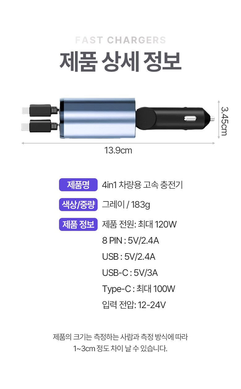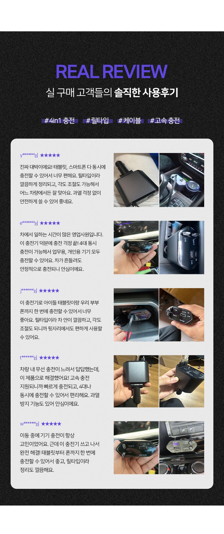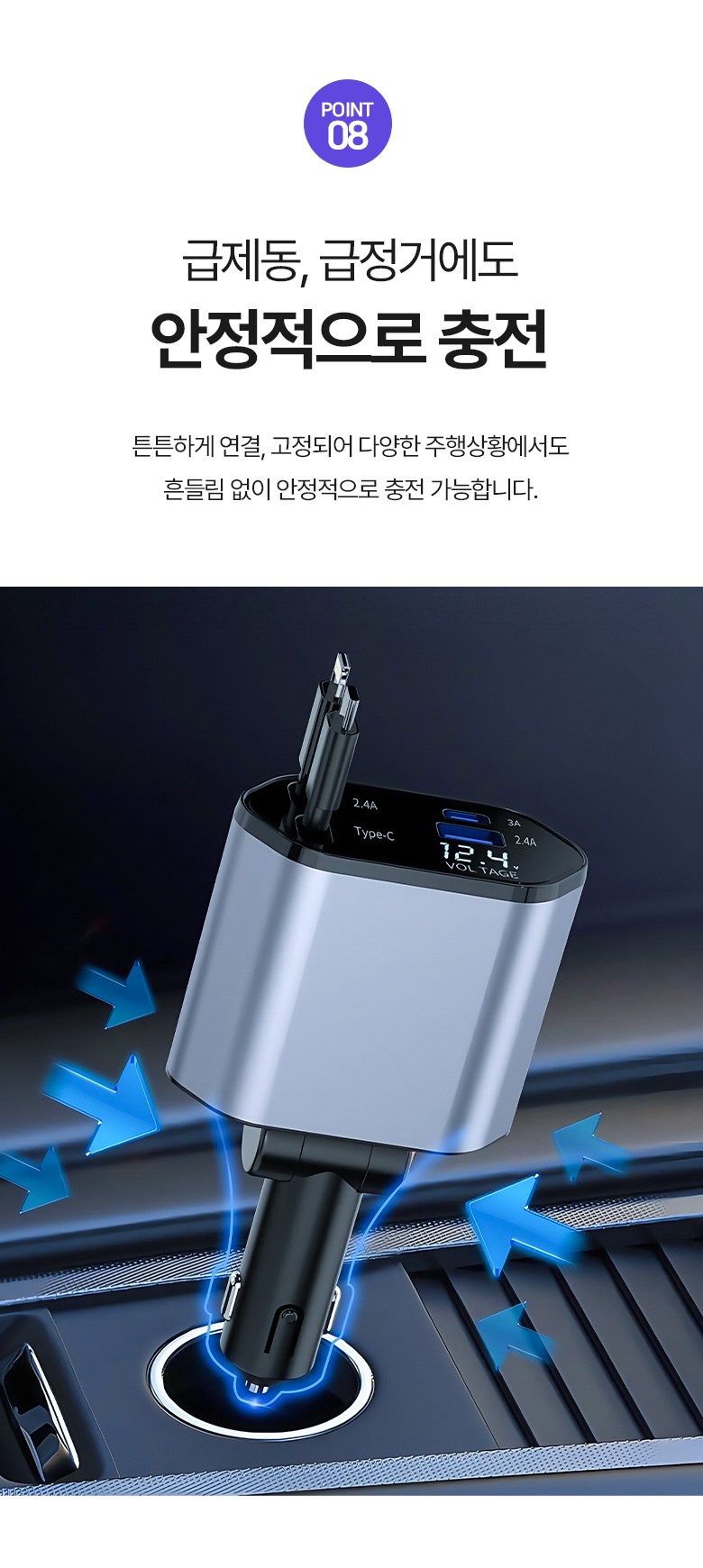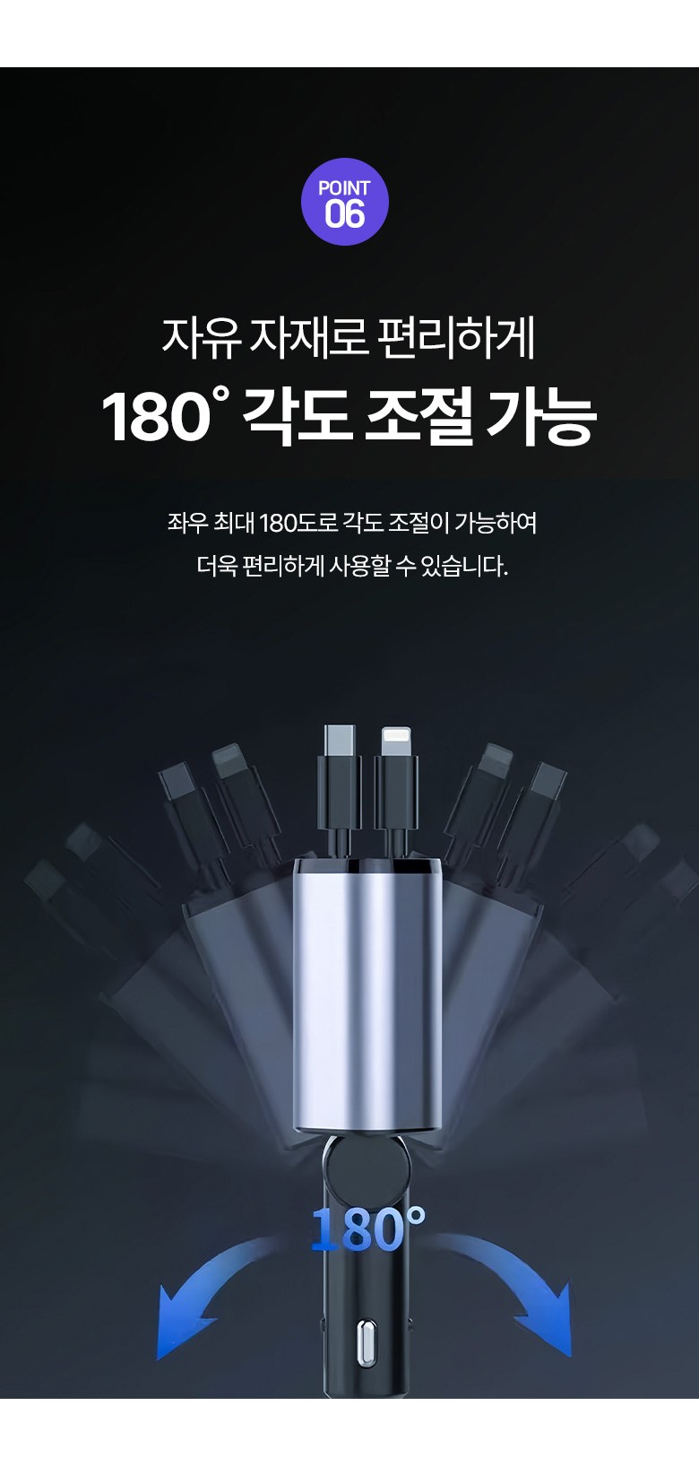 투데이리빙 4in1 릴타입 차량용 고속 충전기 각도 조절 c타입 8핀 핸드폰 동시 4대 충전 케이블 usb 어댑터 휴대폰 퀵차지 릴케이블 시거잭 릴충전기