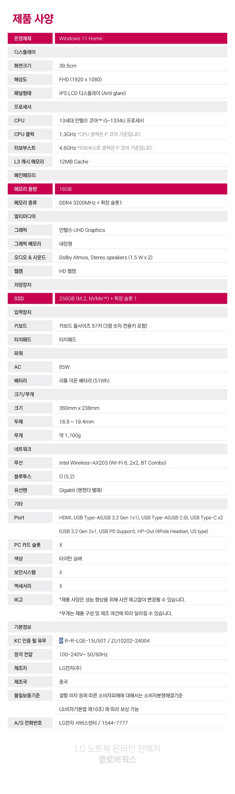 | 품명 및 모델명 | 노트북 컴퓨터 (15UD50T) | KC 인증정보 | R-R-LGE-15U50T / ZU10202-24004 |