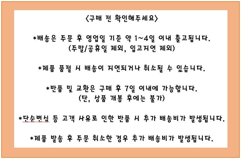 | 배송방법 | 순차배송 | 배송비 | 3,000원 - 100,000원 이상 구매 시 무료배송 - 도서산간 지역 배송불가 |