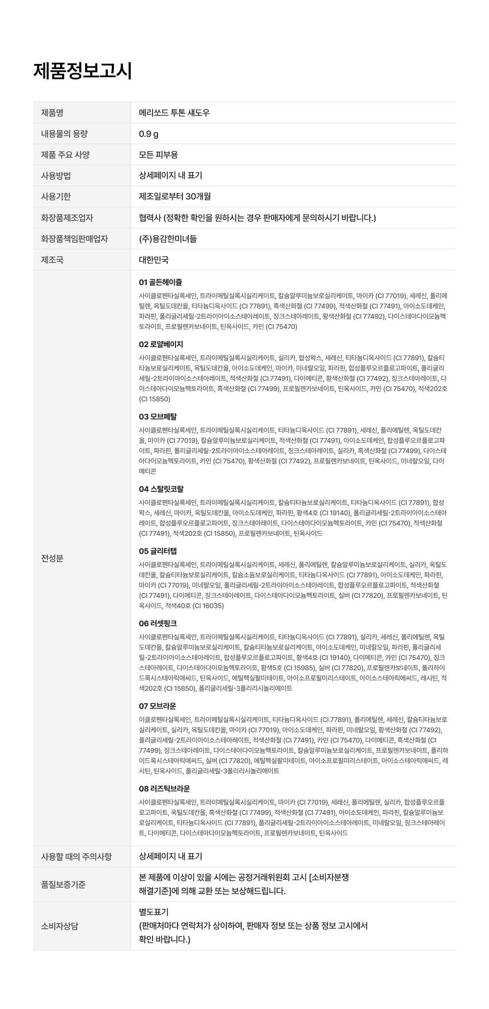 | 화장품제조업자, 화장품책임판매업자 및 맞춤형화장품판매업자 | (주)씨앤씨인터내셔널 / (주)용감한미녀들 | 제조국 | 대한민국 |