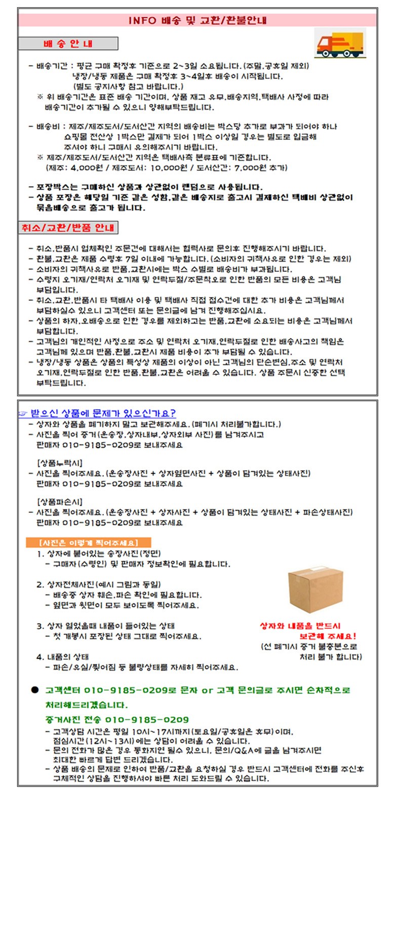 - ㆍ모니터 해상도의 차이로 인해 색상이나 이미지가 실제와 달라, 고객이 단순 변심으로 교환/반품을 무료로 요청하는 경우