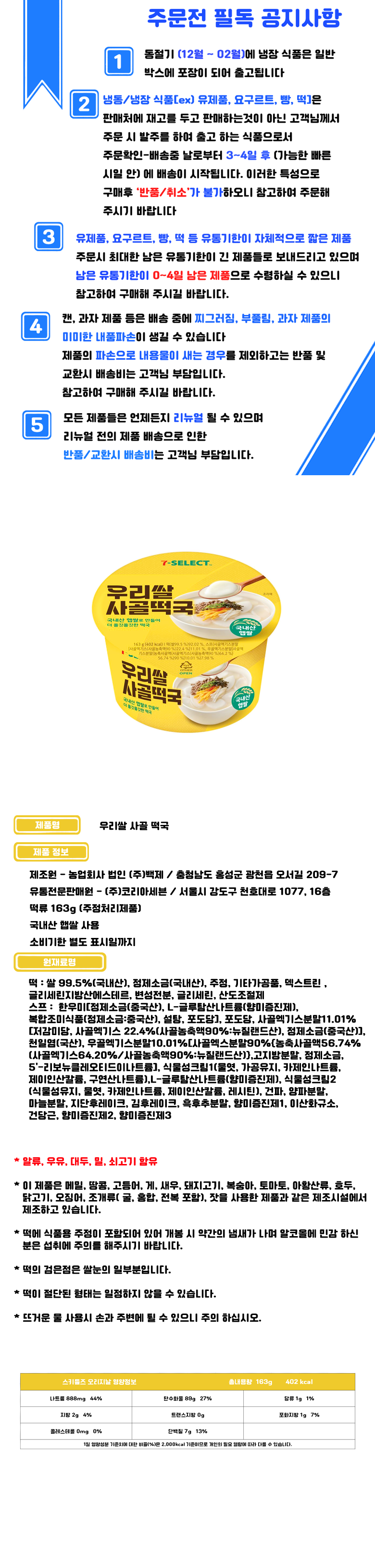 | 생산자 및 소재지 | 상품 상세페이지 참조 | 제조연월일, 소비기한 또는 품질유지기한 | 상품 상세페이지 참조 |