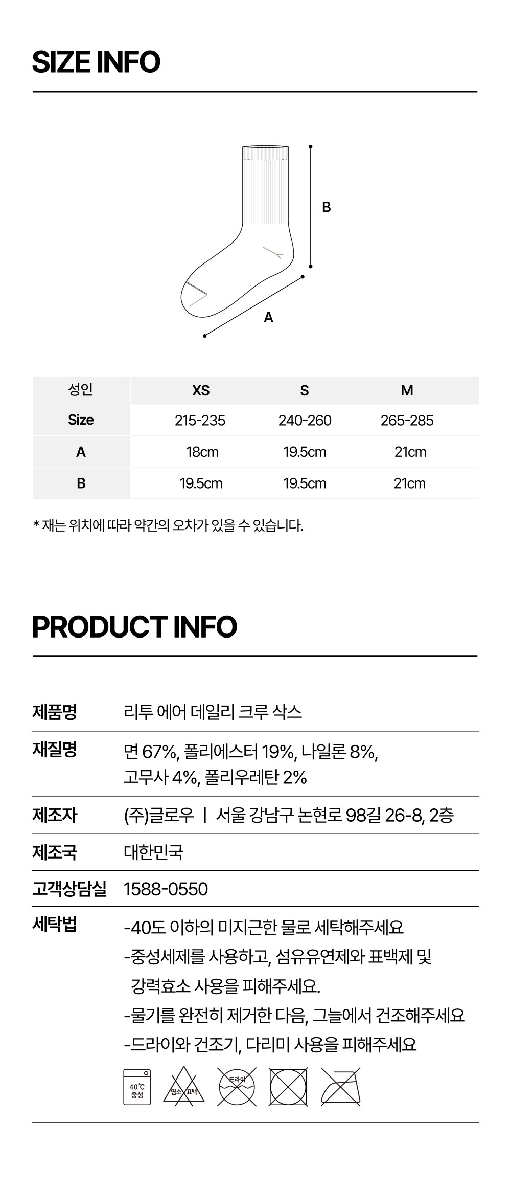 | 품명 및 모델명 | 리투 에어 데일리 크루 삭스 블랙(10팩) S | KC 인증정보 | 해당없음 |