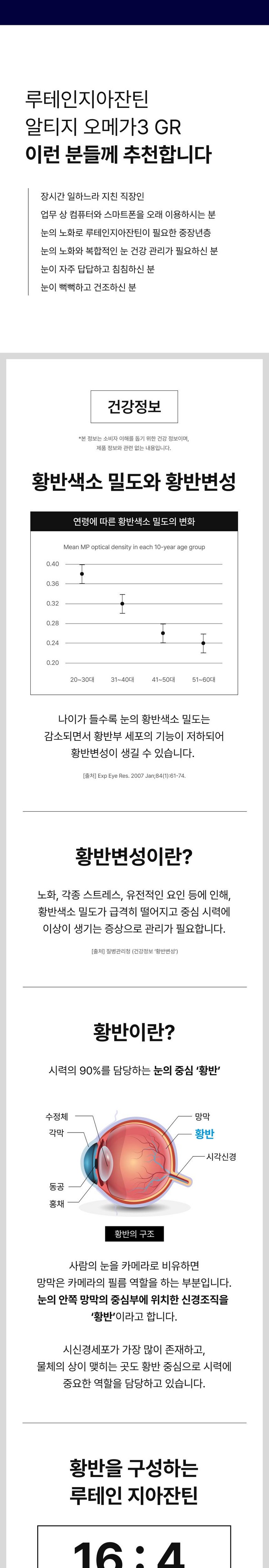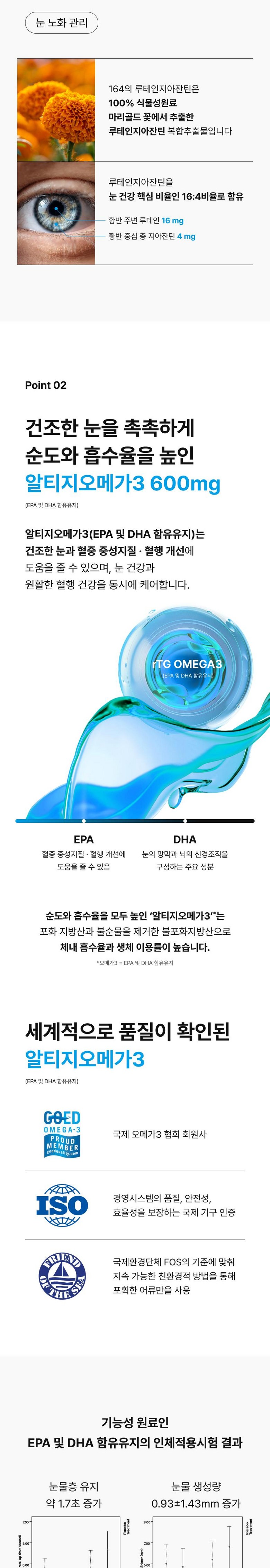 | 원료명 및 함량 | 루테인지아잔틴복합추출물20%(멕시코산) 8.35421%, EPA및DHA함유유지(프랑스산) 75.18800%, 비타민C 3.54424%, 건조효모(셀레늄함유) 1.80921%, d-α-토코페롤 0.57606%, 산화아연 0.35303%, 혼합제제(비타민A팔미테이트, 땅콩오일, dl-α-토코페롤) 0.08186%, 혼합제제(비타민D3, 팜유, dl-α-토코페롤) 0.01619%, 밀납(백납) 7.00000%, 콩기름(대두유:태국산) 1.95723%, 대두레시틴 1.00000%, 황산동 0.01000%, 빌베리추출물분말 0.01000%, 황기추출물분말 0.01000%, 락토페린 0.01000%, 밀크칼슘 0.01000%, 강황추출액 0.01000%, 검은콩분말 0.01000%, 산화마그네슘 0.01000%, 녹차추출물분말 0.01000%, 엔테로코커스페슘 0.01000%, 포도과즙분말 0.01000% 캡슐기제 : 정제수 51.70000%, 변성전분 18.50000%, 글리세린 16.50000%, 카라기난 7.30000%, 덱스트린 5.50000%, 카카오색소 0.50000% 알레르기 유발물질 : 땅콩, 대두, 우유 함유 | 영양정보 | 1일 섭취량 : 1캡슐(1,140mg) 1일 섭취량 당 함량 : 열량 10 kcal, 탄수화물 0g(0%), 단백질 0g(0%), 지방 1g(2%), 나트륨 0mg(0%), 루테인 16mg, 총지아잔틴 4mg, EPA와 DHA의 합 600mg, 비타민A 210ug RAE(30%), 비타민C 30mg(30%), 비타민D 3ug(30%), 비타민E 3.3mg α-TE(30%), 아연 2.55mg(30%), 셀레늄 16.5ug(30%) *( )안의 수치는 1일 영양성분기준치에 대한 비율임 |