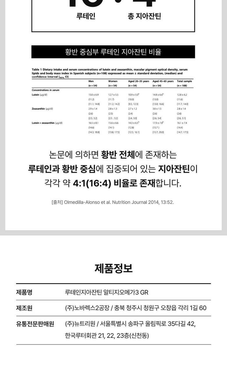 | 제품명 | 뉴트리원 루테인 지아잔틴 164 알티지 오메가3 GR | 제조업소의 명칭과 소재지 | ㈜노바렉스 |