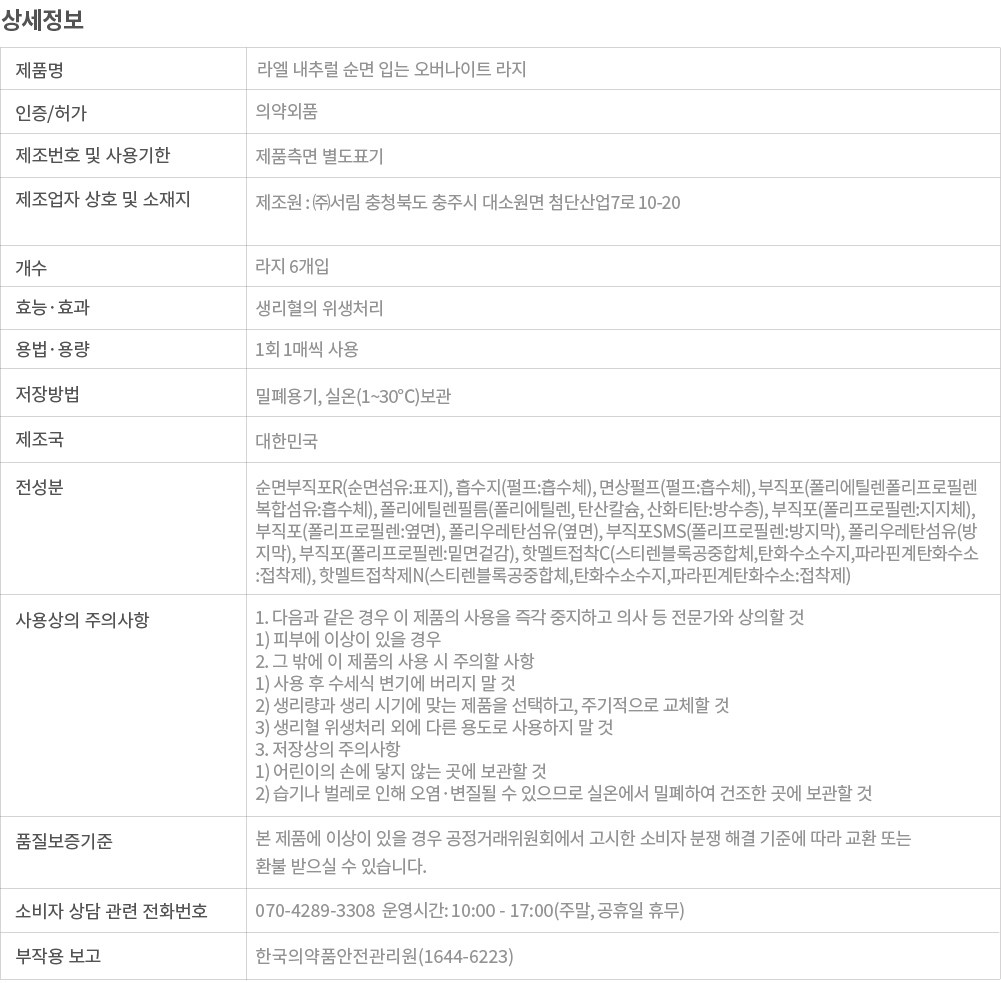 | 품명 및 모델명 | 라엘내추럴순면입는오버나이트라지 | 인증/허가 사항 | 의약외품 |