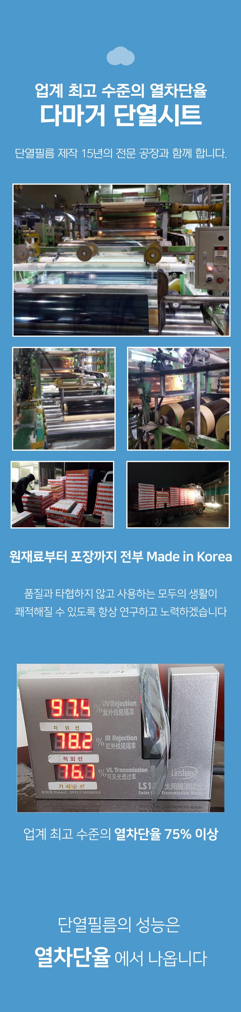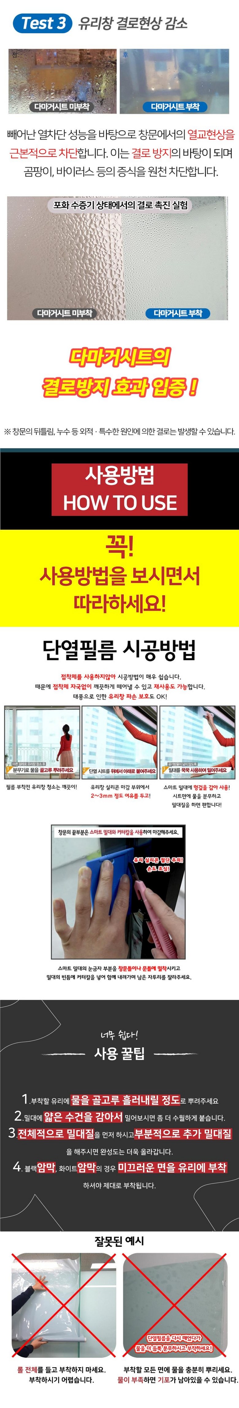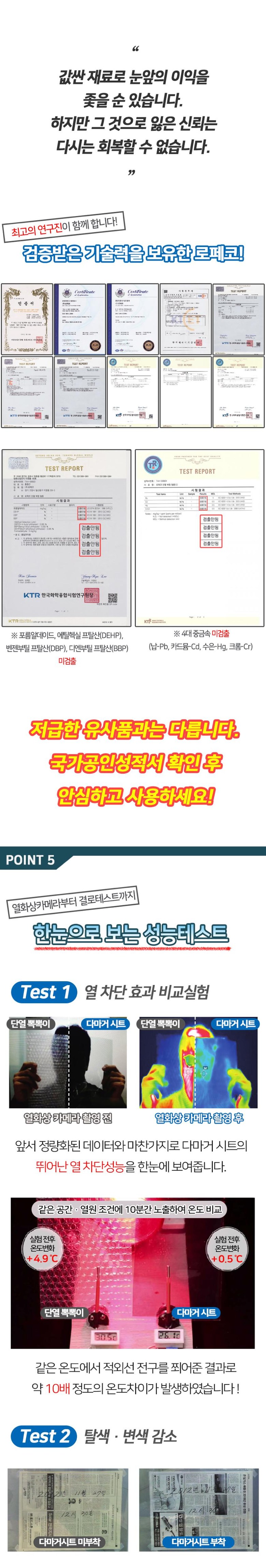 | 품명 및 모델명 | 다마거 결로방지 단열필름/단열시트 | 인증/허가 사항 | 포름알데히드, 프탈레이트, 프탈산, 벤젠프탈산 불검출4대 중금속 불검출(납, 카드늄, 수은, 크롬) |