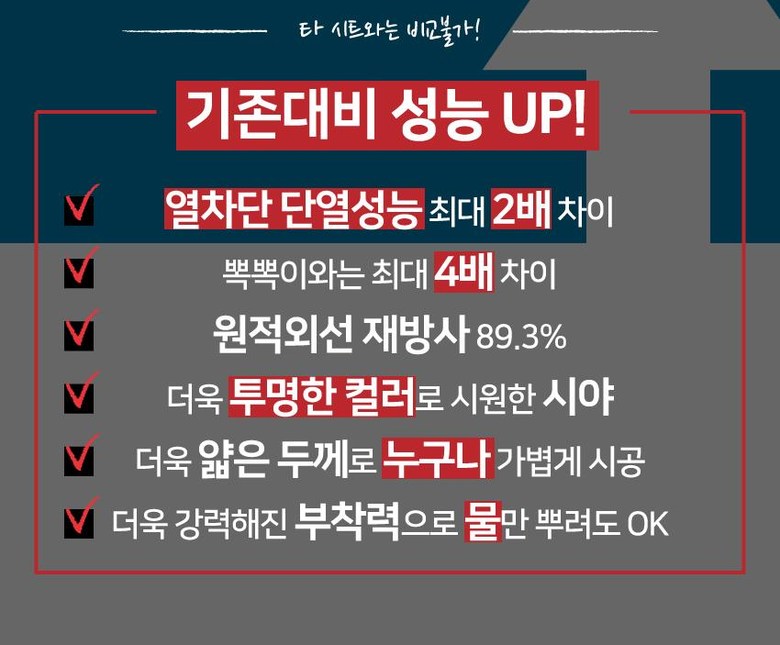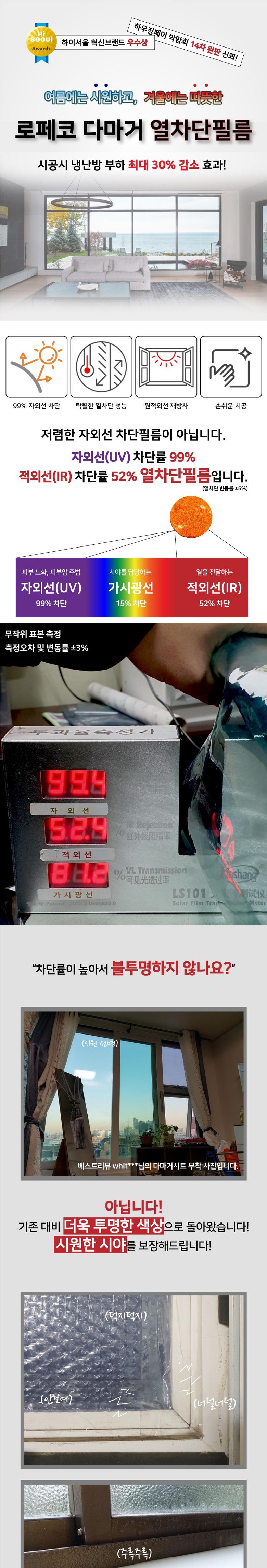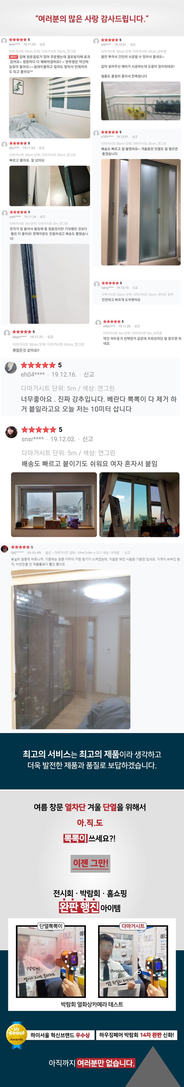 | 품명 및 모델명 | 다마거 결로방지 단열필름/단열시트 | 인증/허가 사항 | 포름알데히드, 프탈레이트, 프탈산, 벤젠프탈산 불검출4대 중금속 불검출(납, 카드늄, 수은, 크롬) |