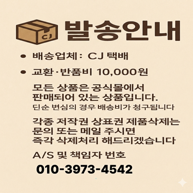 | 교환/반품 비용 (왕복비용) | 10,000원 - 단, 고객 변심의 경우에만 발생 - 도서산간 지역 배송불가 |