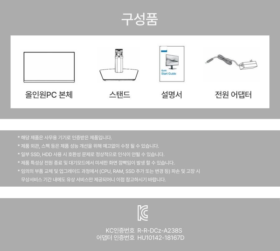 | 품명 및 모델명 | 디클 올인원 PC / A238S | KC 인증정보 | 본품: R-R-DCz-A238S / 어댑터: HU10142-18167D, R-REM-FSZ-FSP060-DHAN3 / 전원코드: SU04148-19001 / 키보드: R-R-DCz-DWK03 / 키보드 전지: B053R5048-24003 / 마우스: R-R-DCz-DWM03 / 마우스 전지: B053R5048-24002 / 리시버: R-R-DCz-DWR03 |