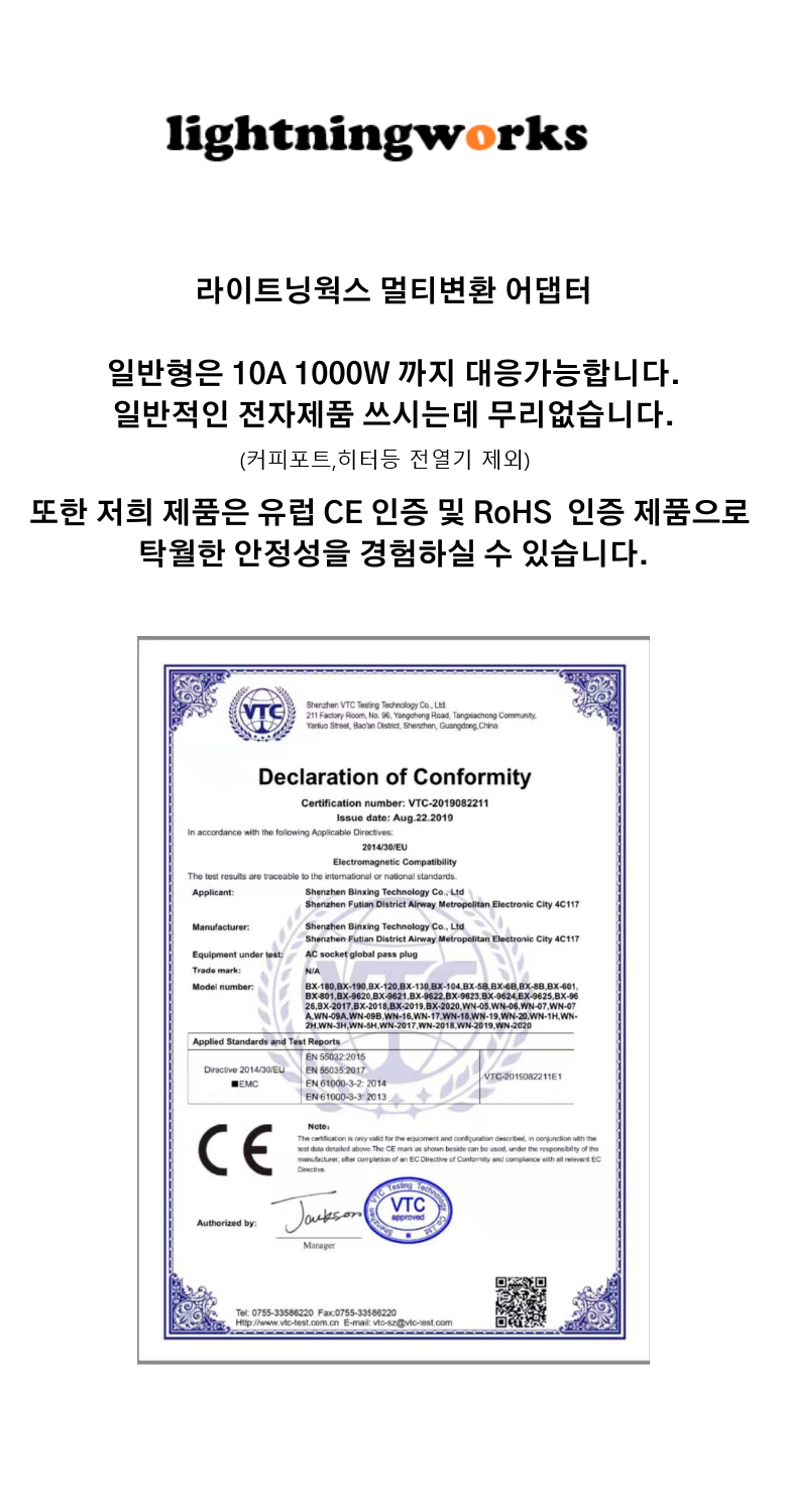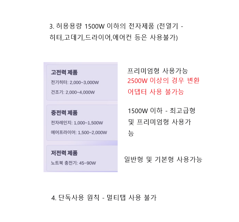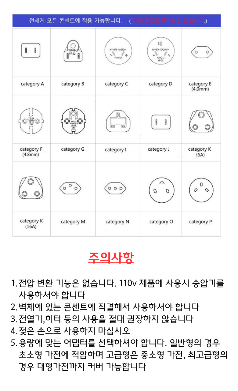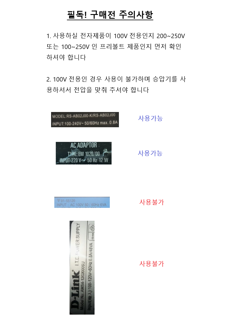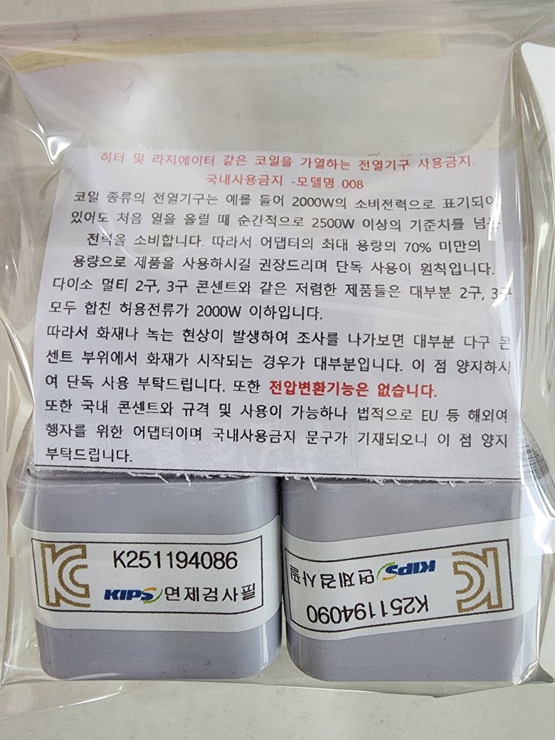 또한 국내 콘센트와 규격 및 사용이 가능하나 법적으로 EU 등 해외여행자를 위한 어댑터이며 국내사용금지 문구가 기재되오니 이 점 양지 부탁드립니다.