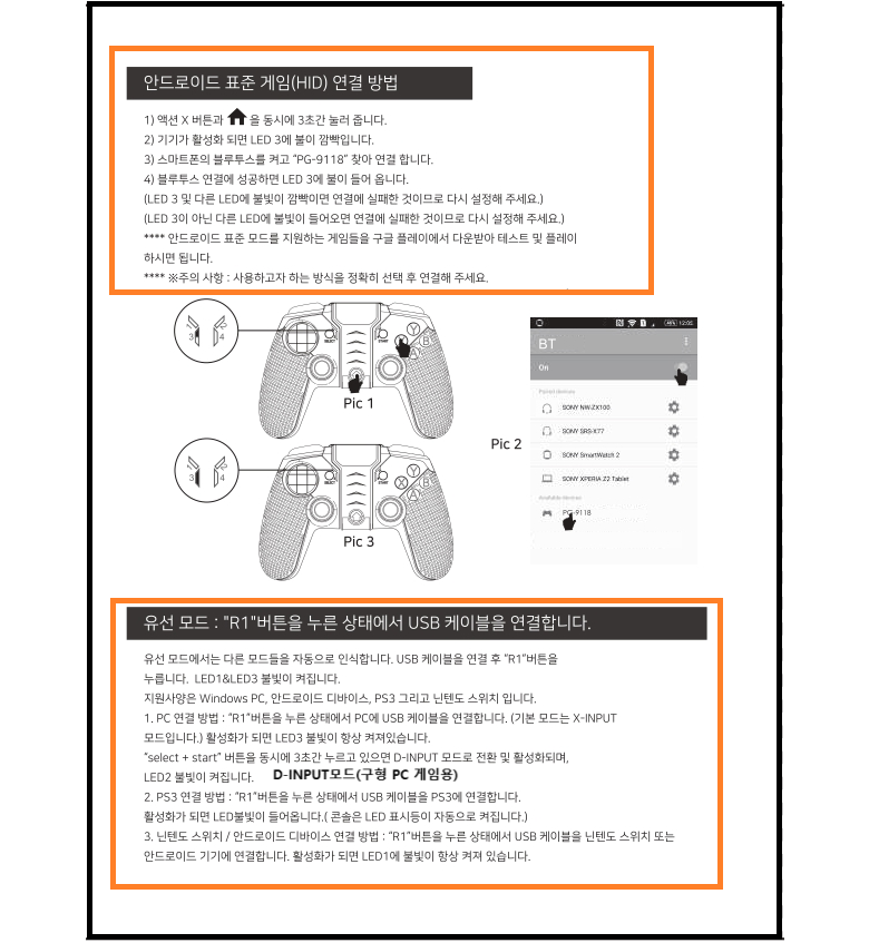 - 반드시 매핑 모드 (A + HOME 버튼으로 연결하는 모드)로 전환 후에 블루투스 연결을 하셔야 합니다.