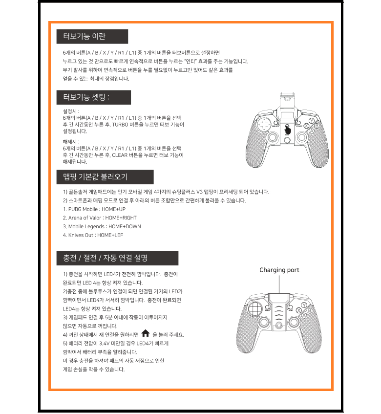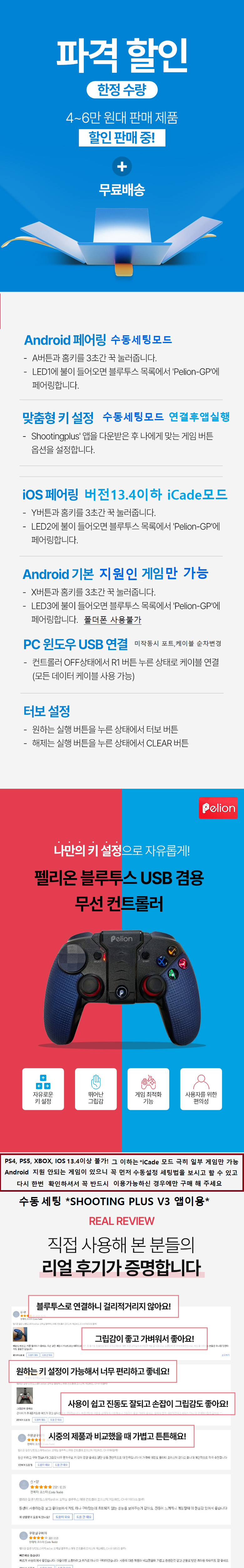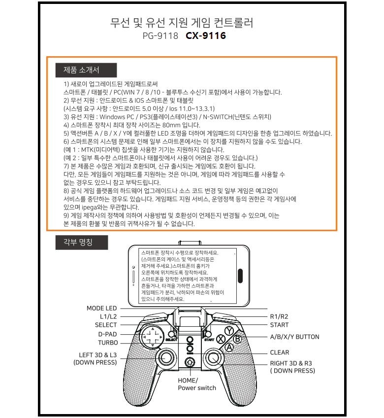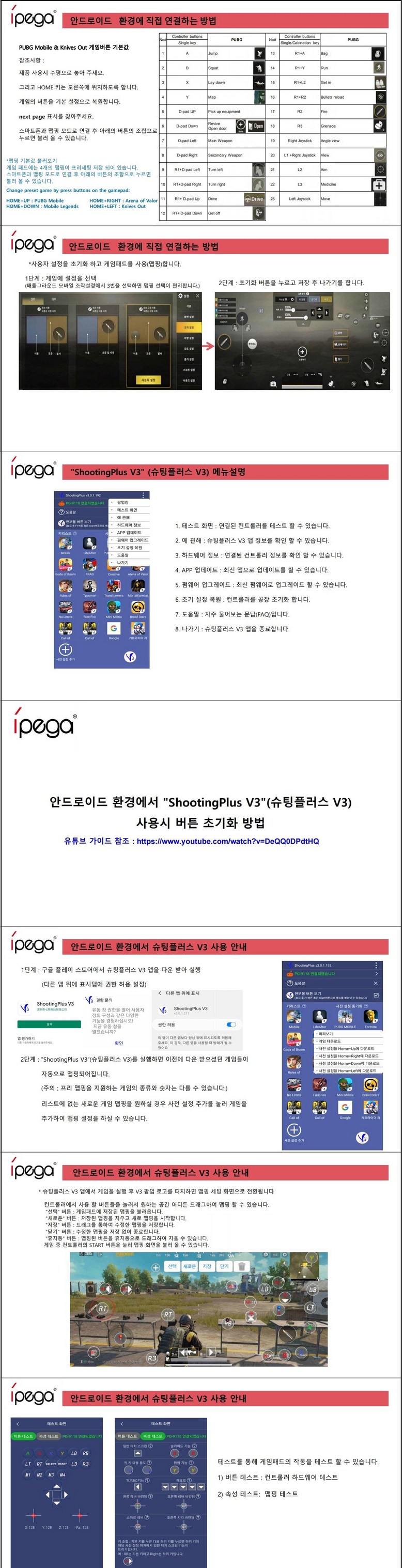 - PG-9118은 슈팅플러스 V3 앱을 지원하여, 컨트롤러를 지원하지 않는 스마트폰 게임에서도 매핑을 사용해 버튼을 커스텀마이징하여 게임을 즐길 수 있습니다.