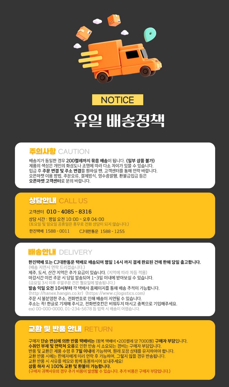 - ㆍ모니터 해상도의 차이로 인해 색상이나 이미지가 실제와 달라, 고객이 단순 변심으로 교환/반품을 무료로 요청하는 경우