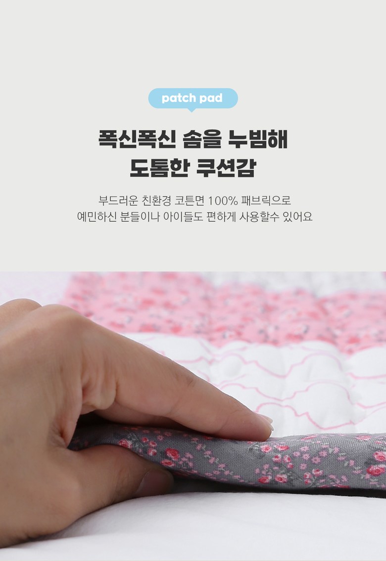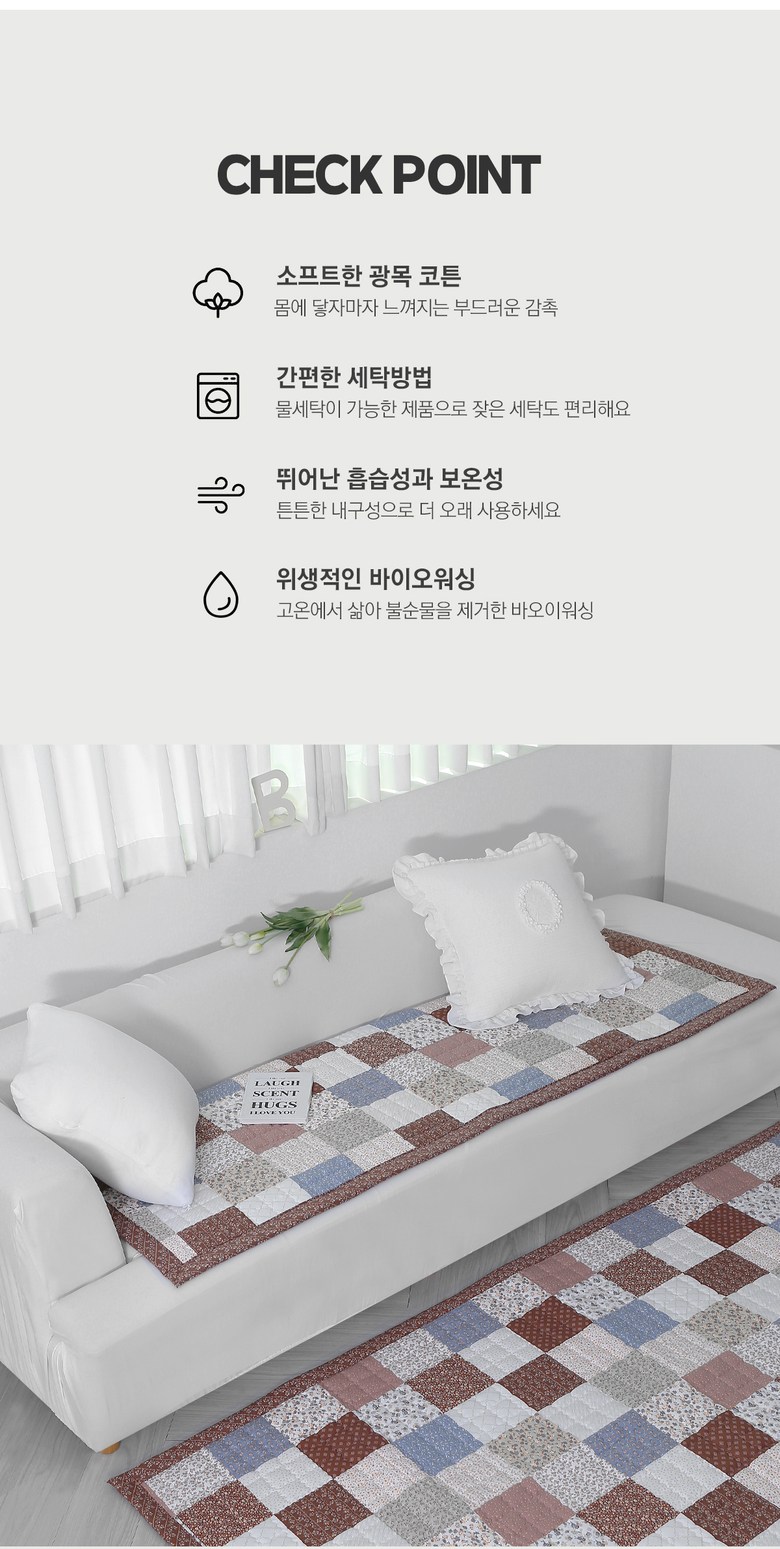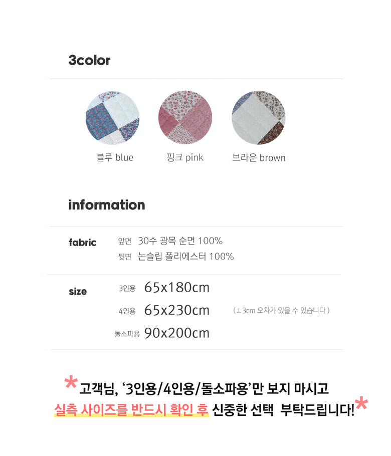 | 제품 소재 | 앞면: 30수광목면100% 뒷면: 논슬립 폴리 | 색상 | 핑크, 블루, 브라운 |