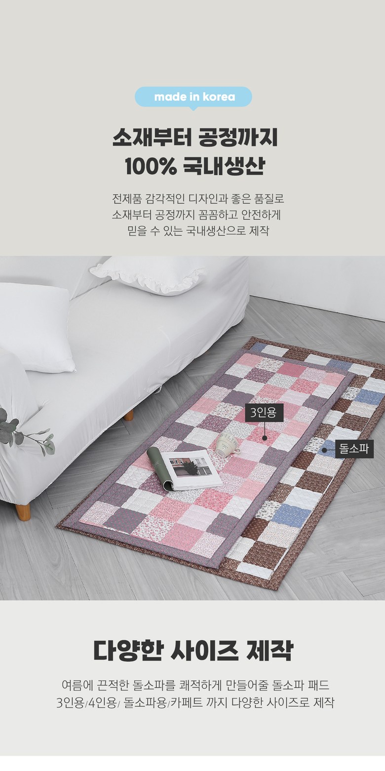 | 치수 | 3인용(65x180cm) 4인용(65x230cm) 돌소파용(90x200cm) | 제품구성 | 소파 패드 |