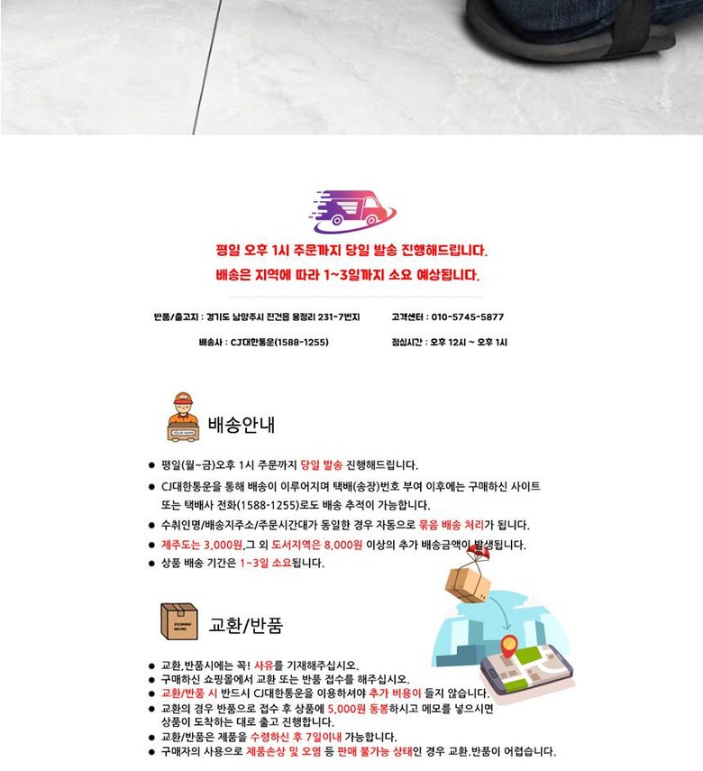 - ㆍ모니터 해상도의 차이로 인해 색상이나 이미지가 실제와 달라, 고객이 단순 변심으로 교환/반품을 무료로 요청하는 경우
