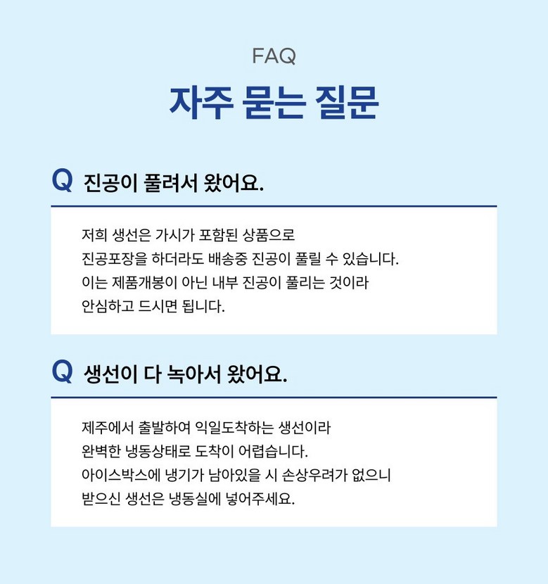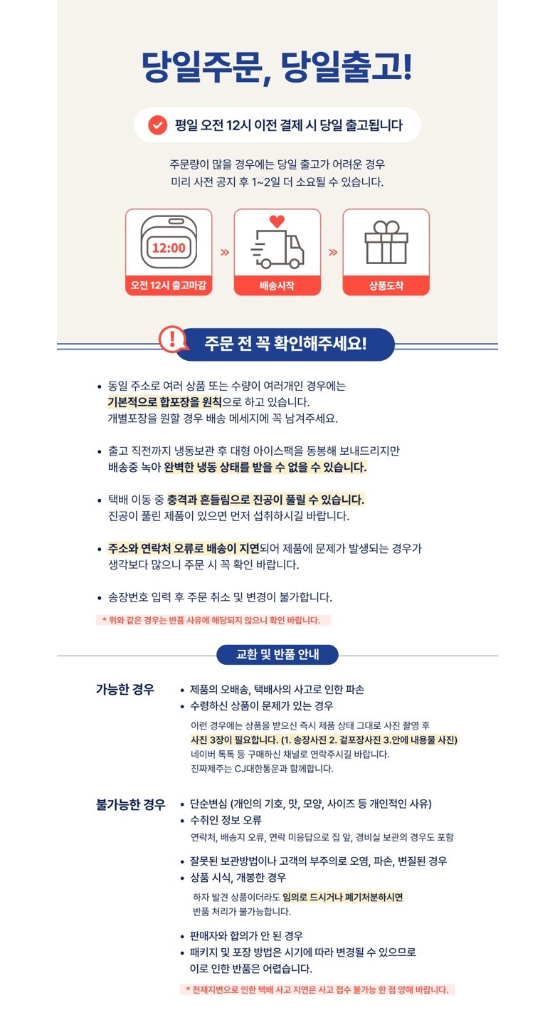 | 배송방법 | 신선/냉장/냉동 | 배송비 | 무료배송 - 도서산간 지역 배송불가 |