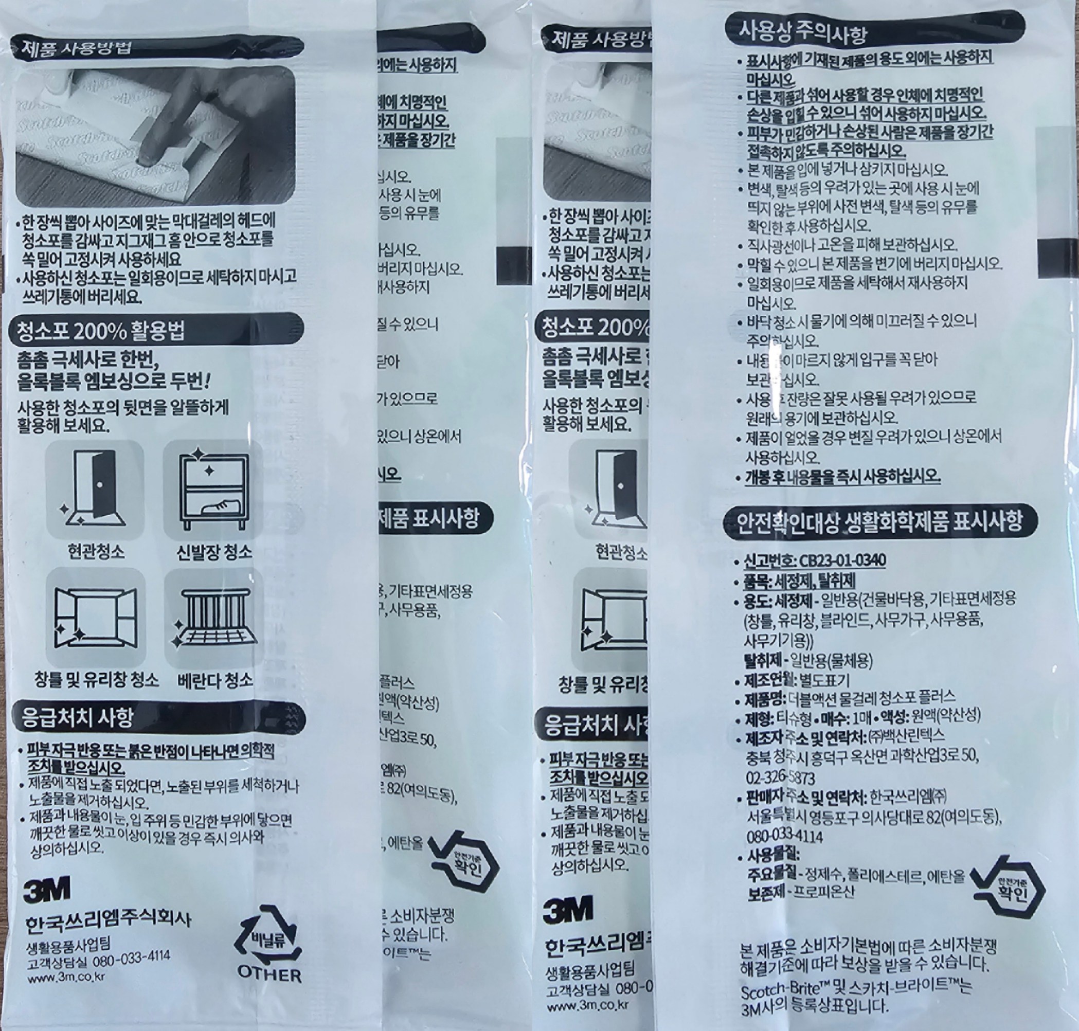 | 품명 및 모델명 | 3M 올터치 막대걸레 표준형 스타터팩 | 인증/허가 사항 | 물걸레 청소포 : CB23-01-0340 그외: 해당없음 |