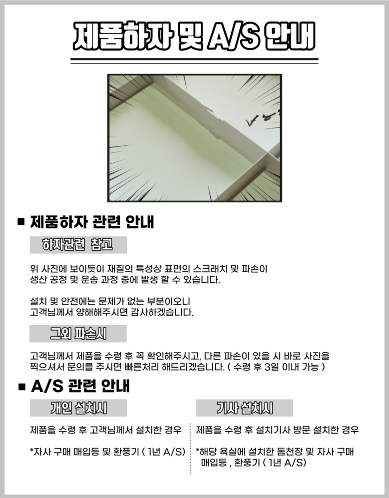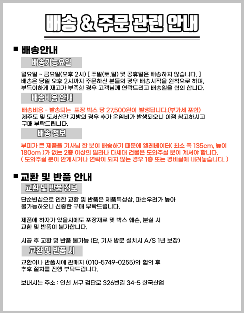 - ㆍ모니터 해상도의 차이로 인해 색상이나 이미지가 실제와 달라, 고객이 단순 변심으로 교환/반품을 무료로 요청하는 경우