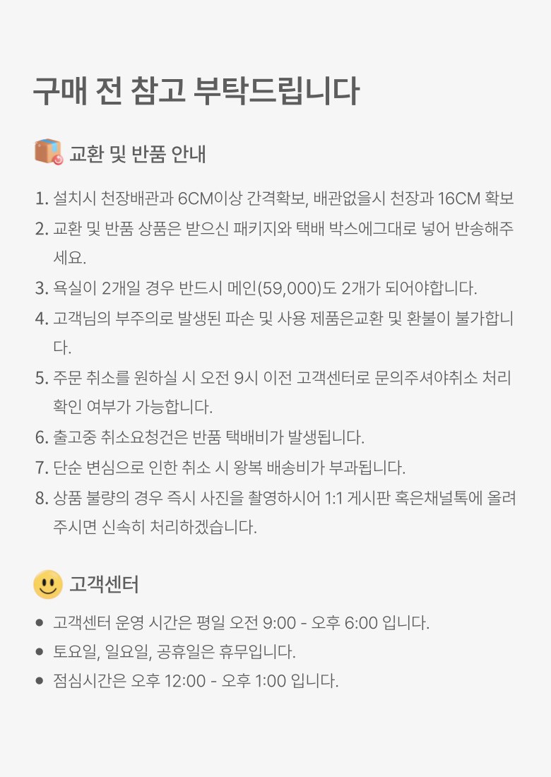 - ㆍ교환/반품에 관한 일반적인 사항은 판매자가 제시사항보다 관계법령이 우선합니다.