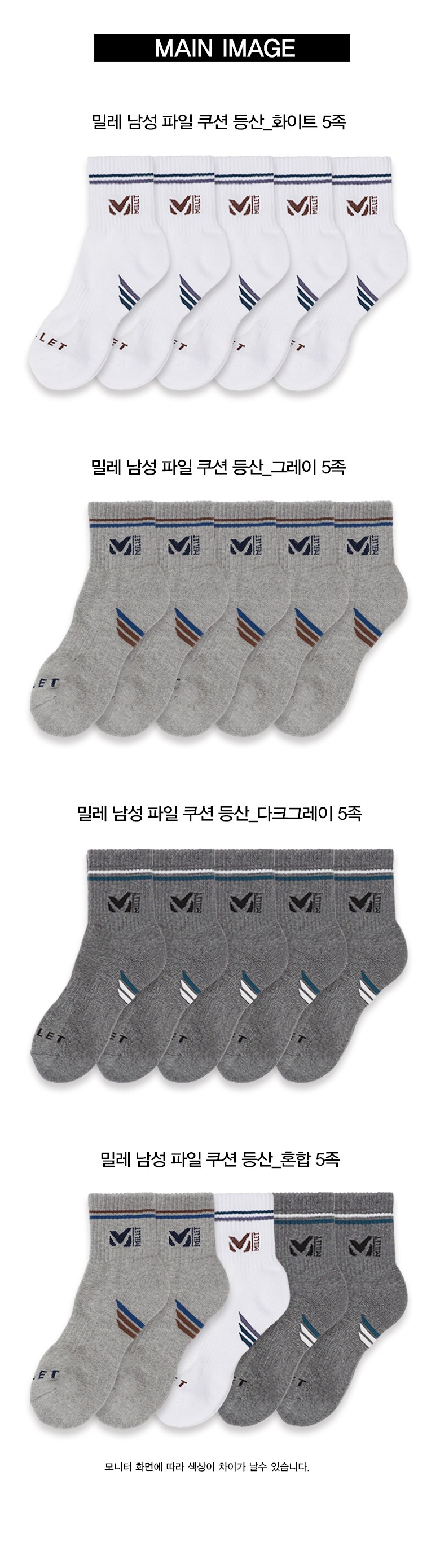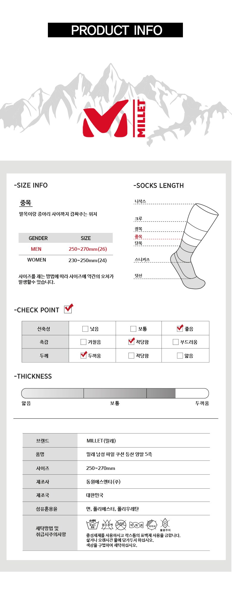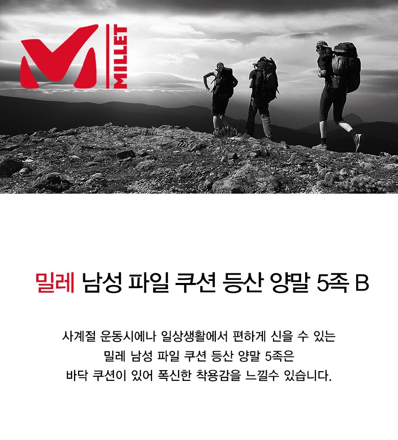 | 품명 및 모델명 | 밀레 남성용 파일 쿠션 등산 양말 5족 세트 B | KC 인증정보 | 해당없음 |