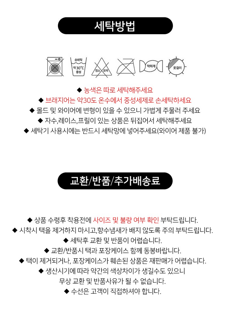 - ㆍ모니터 해상도의 차이로 인해 색상이나 이미지가 실제와 달라, 고객이 단순 변심으로 교환/반품을 무료로 요청하는 경우
