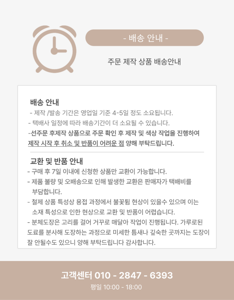 - ㆍ모니터 해상도의 차이로 인해 색상이나 이미지가 실제와 달라, 고객이 단순 변심으로 교환/반품을 무료로 요청하는 경우